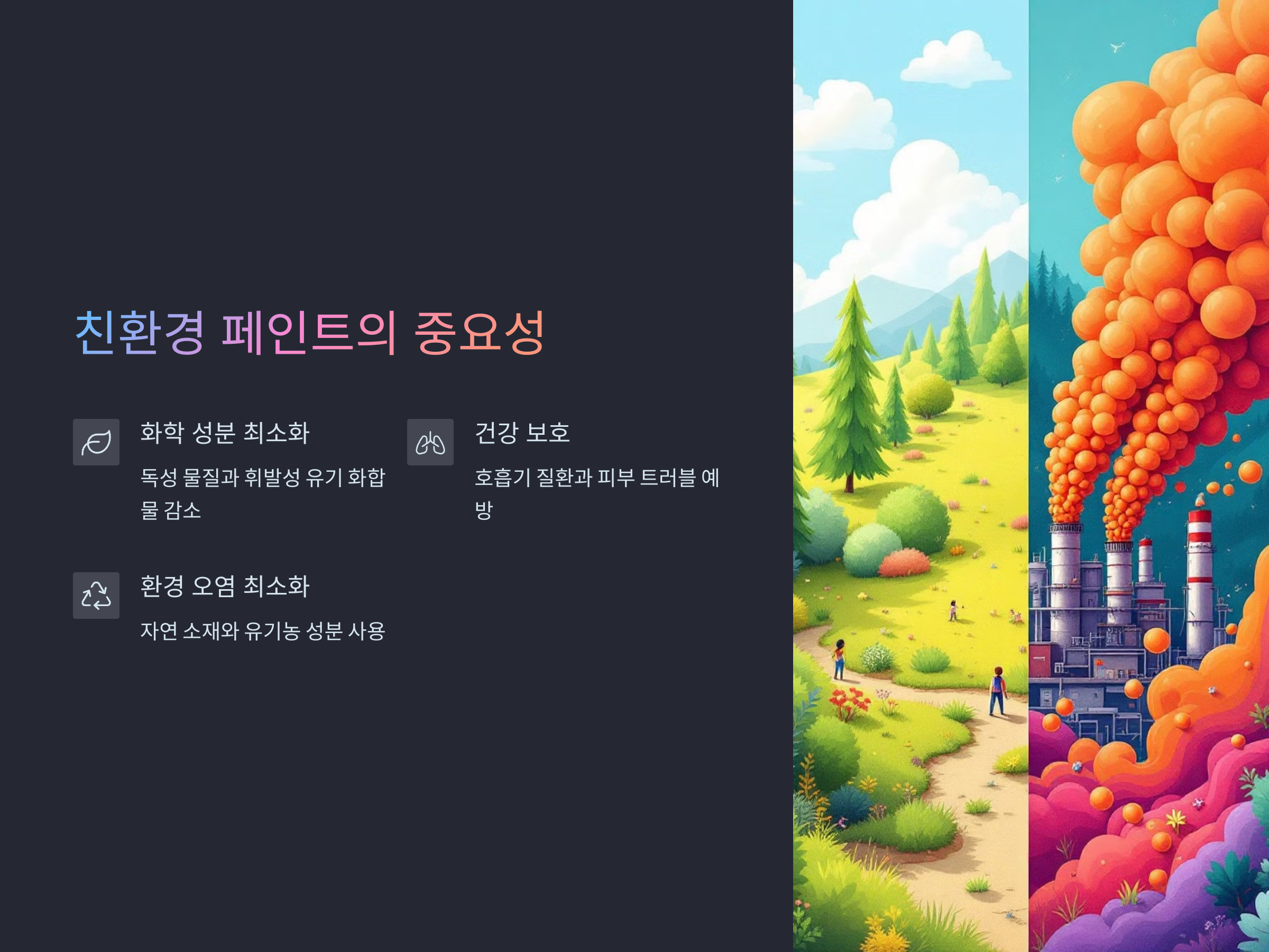 친환경 페인트를 선택하는 가장 큰 이유 중 하나는 건강에 미치는 영향입니다. 실내에서 사용되는 페인트가 건강에 해로운 물질을 포함하고 있다면, 이로 인해 호흡기 질환이나 피부 트러블을 유발할 수 있습니다. 특히 어린이나 임산부에게는 더욱 민감하게 작용할 수 있으므로, 안전한 재료를 사용하는 것이 필수적입니다.