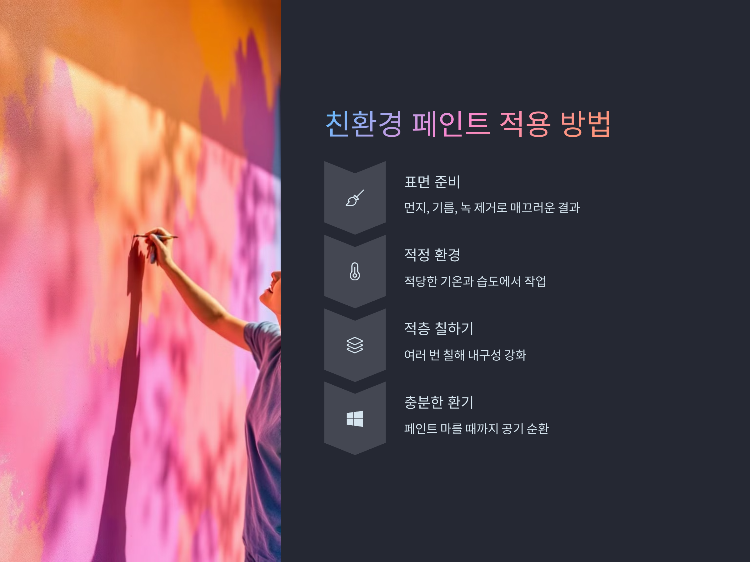 친환경 페인트는 전원주택에 적용할 때 몇 가지 주의할 점이 있습니다. 이를 잘 지키면 페인트의 효과와 내구성을 극대화할 수 있습니다.