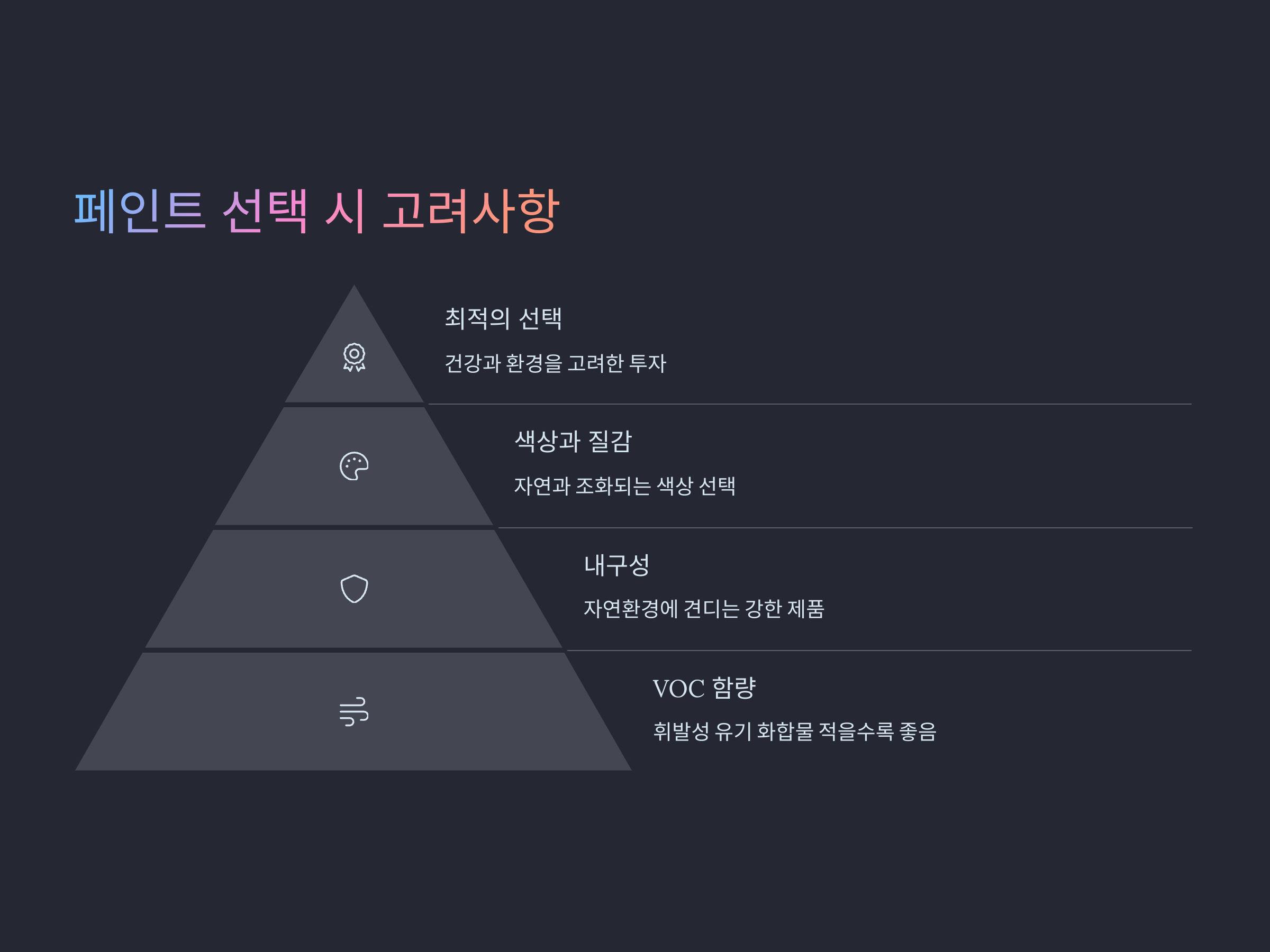 친환경 페인트를 선택할 때는 몇 가지 중요한 요소를 고려해야 합니다. 이를 통해 보다 효율적이고 안전한 페인트 선택이 가능합니다.
