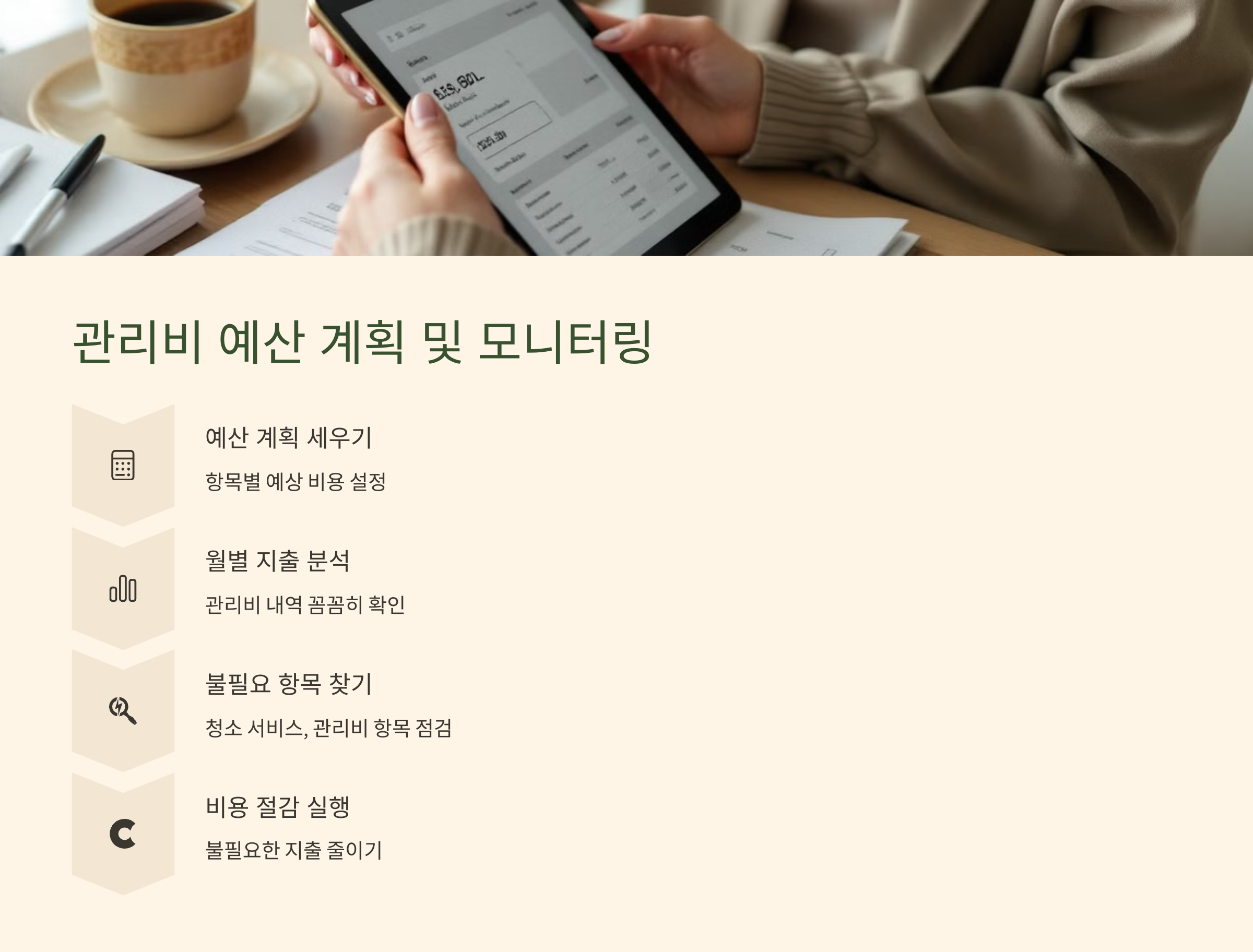 매달 관리비 지출 내역을 꼼꼼히 분석하고, 불필요한 항목이 있는지 점검하는 습관을 들이면 관리비 절감이 가능합니다. 예를 들어, 청소 서비스나 관리비 항목 중 불필요한 비용을 찾아내어 줄일 수 있습니다.