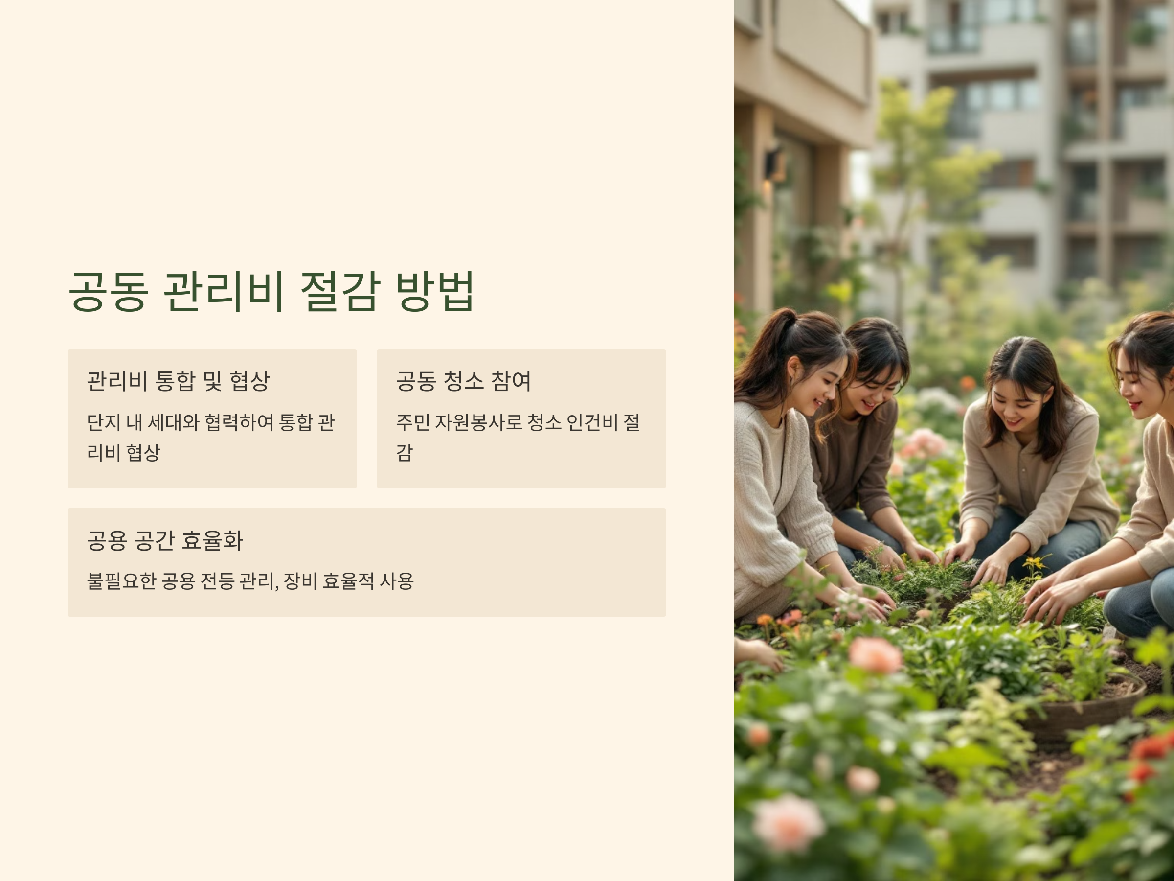 공용 공간의 청소나 조경 비용을 절감할 수 있는 방법도 중요합니다. 예를 들어, 관리인에게 맡기지 않고 주민들이 자원봉사로 청소를 맡는 방식으로 인건비를 절감할 수 있습니다. 또한, 불필요한 공용 공간의 전등을 꺼두거나, 공용 장비를 효율적으로 관리하여 비용을 줄이는 방법도 있습니다.