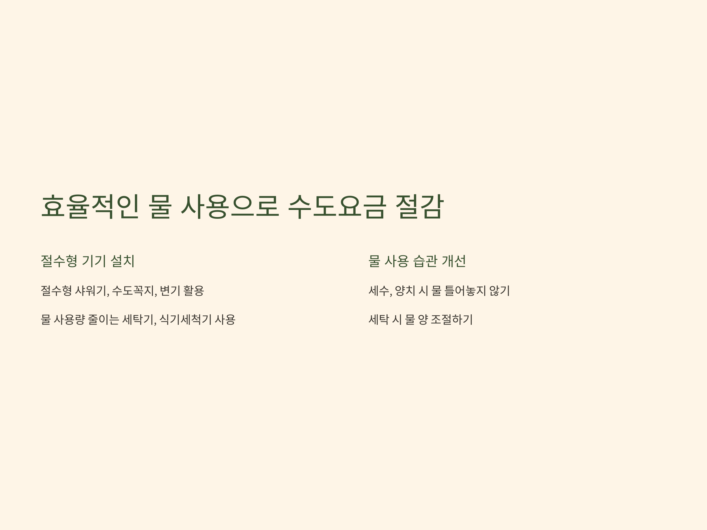 수도 요금도 관리비에 포함되는 중요한 항목입니다. 불필요한 물 낭비를 줄이는 방법만으로도 매달 많은 비용을 절감할 수 있습니다.