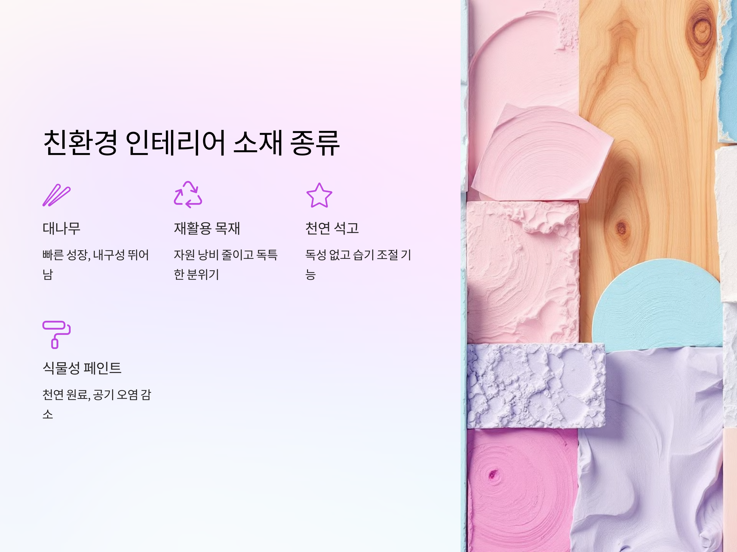친환경 인테리어에서 자주 사용되는 소재들은 다양합니다. 그 중에서도 특히 주목할 만한 소재들에는 대나무, 재활용 목재, 천연 석고, 식물성 페인트 등이 있습니다.