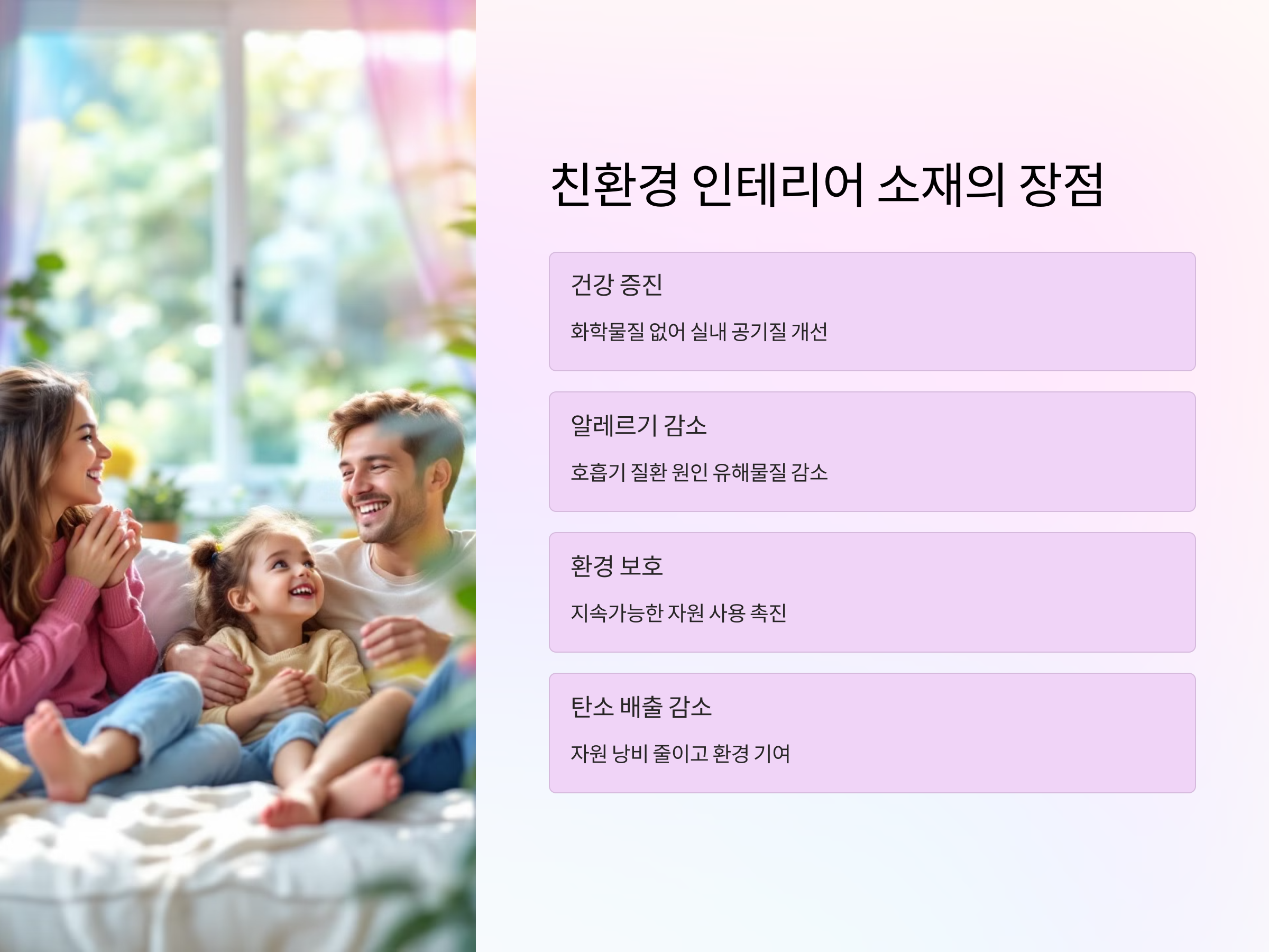 친환경 인테리어 소재를 사용하는 가장 큰 장점은 건강에 미치는 긍정적인 영향입니다. 화학 물질이 포함되지 않아 실내 공기의 질을 개선하고, 알레르기나 호흡기 질환의 원인이 되는 유해 물질을 줄일 수 있습니다. 예를 들어, 기존의 합성 페인트나 바닥재는 포름알데히드와 같은 유해 물질을 방출할 수 있는데, 친환경 소재는 이를 대체하여 더 건강한 환경을 제공합니다.