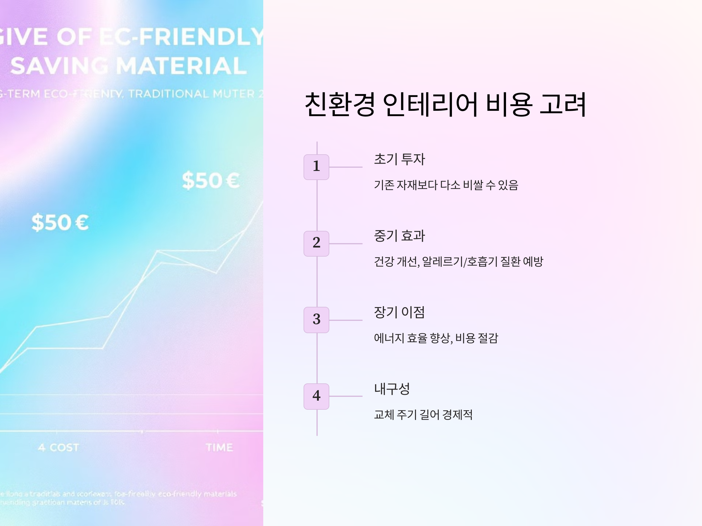 친환경 인테리어는 기존의 자재보다 가격이 다소 비쌀 수 있습니다. 하지만, 장기적으로 보면 에너지 절약과 건강 개선 등 다양한 이점을 고려했을 때 충분히 투자할 가치가 있습니다. 예를 들어, 친환경 소재로 꾸민 집은 실내 공기 질이 좋아져 알레르기나 호흡기 질환을 예방할 수 있으며, 에너지 효율이 좋아져 장기적으로 비용 절감 효과를 볼 수 있습니다.