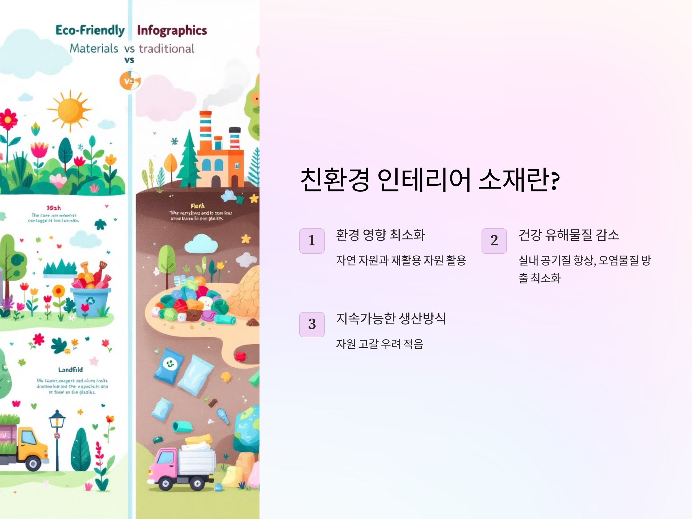 친환경 인테리어 소재는 환경에 미치는 영향을 최소화하고, 건강에 해로운 물질을 줄이는 자재입니다. 기존의 화학 물질이나 합성 소재들이 포함된 자재들과는 달리, 자연에서 얻은 자원이나 재활용 자원을 사용하는 특징이 있습니다. 이러한 소재들은 지속 가능한 방식으로 생산되며, 건물의 실내 공기 질을 향상시키고, 오염물질의 방출을 최소화합니다.