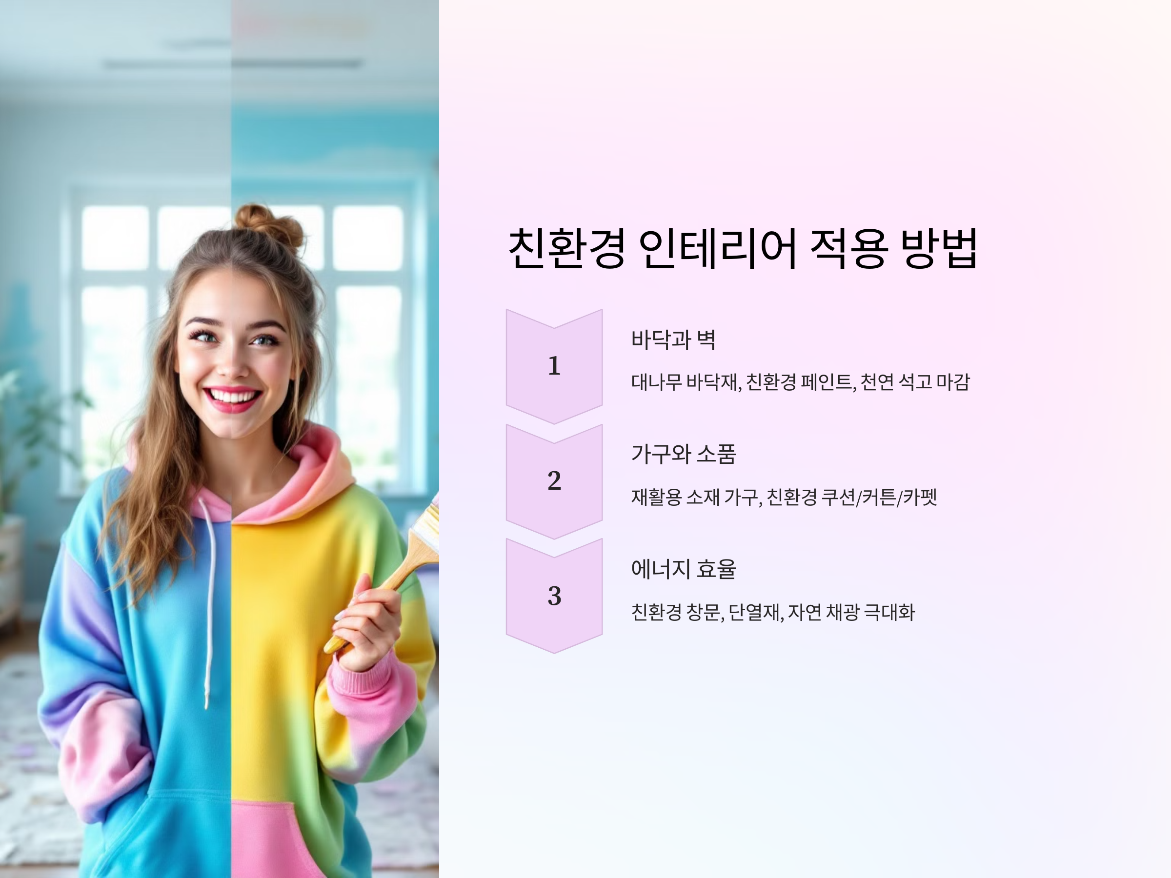 친환경 인테리어를 실생활에 적용하는 방법은 다양합니다. 첫 번째로, 대나무나 재활용 목재로 바닥재를 선택하거나, 벽을 꾸밀 때 친환경 페인트를 사용하는 방법이 있습니다. 또한, 천연 석고로 벽을 마감하면 실내의 습기 조절과 공기 정화에 효과적입니다.