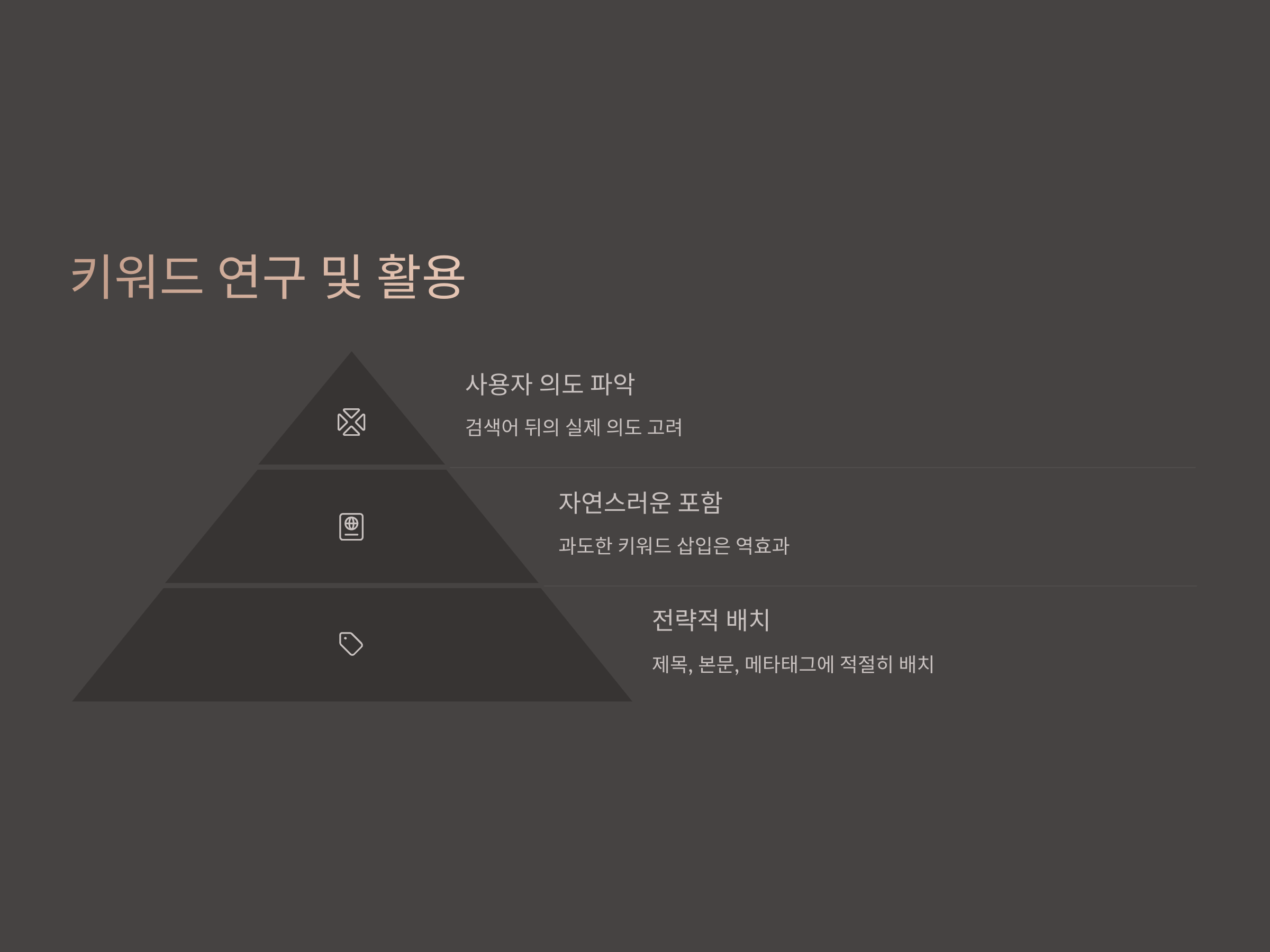 또한, 키워드를 사용할 때는 자연스럽게 포함시키는 것이 중요합니다. 과도한 키워드 삽입은 오히려 역효과를 불러일으킬 수 있으며, 구글 알고리즘이 이를 '키워드 스태핑'으로 판단할 수 있습니다. 키워드는 제목, 본문, 메타 태그, 이미지 ALT 태그 등 다양한 위치에 적절히 배치하여, 검색 엔진이 해당 페이지의 내용을 쉽게 이해하도록 해야 합니다.