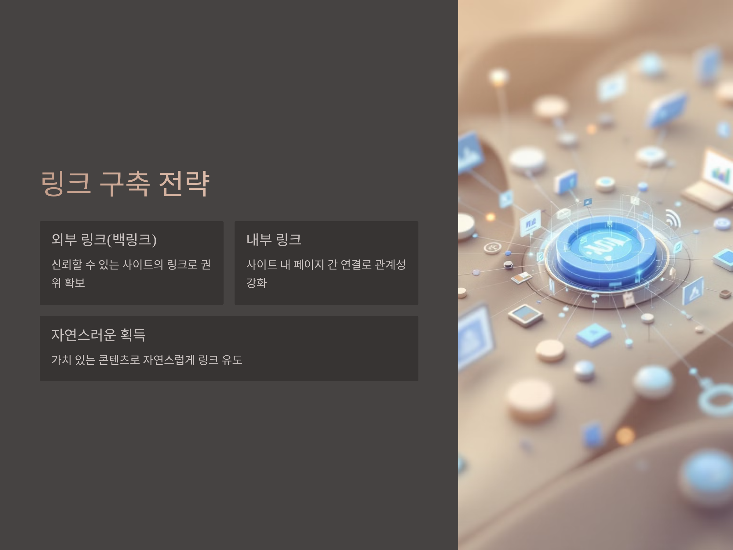 링크 구축을 위해서는 콘텐츠가 가치 있고, 유용하다는 인식을 줄 수 있어야 합니다. 이를 위해서는 다른 블로그나 웹사이트와의 협업을 통해 링크를 자연스럽게 얻거나, 유용한 정보를 제공하는 콘텐츠를 작성하여 자연스럽게 링크를 얻는 방법이 있습니다. 내부 링크 역시 중요하며, 사이트 내 다른 페이지와 연결되어 있어 검색 엔진이 페이지 간의 관계를 쉽게 이해할 수 있도록 도와줍니다.