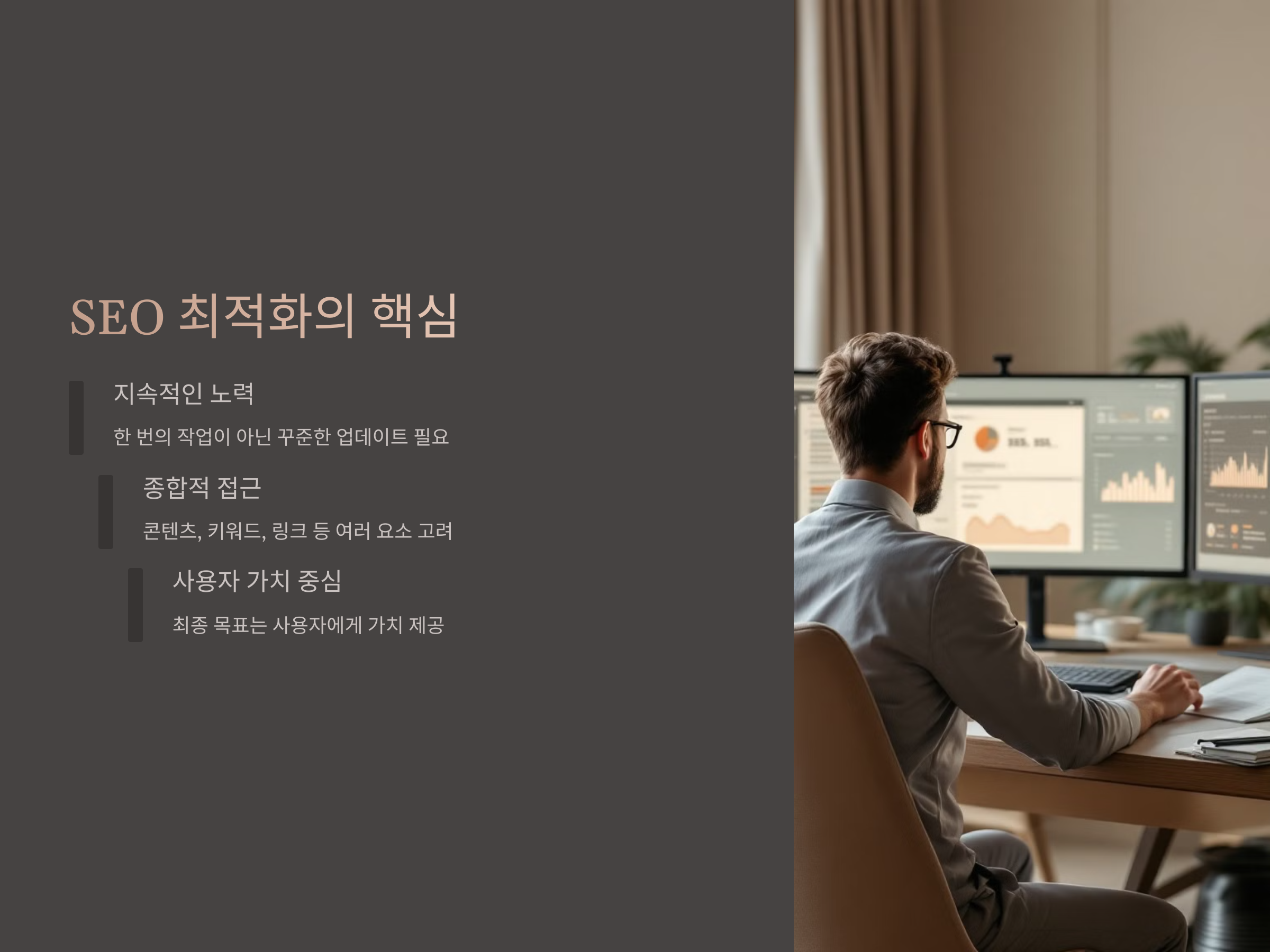 SEO 최적화는 한 번의 작업으로 끝나는 것이 아닙니다. 구글 알고리즘은 계속해서 변화하고 있으며, 검색 트렌드도 달라지기 때문에 SEO 전략도 지속적으로 업데이트되어야 합니다. 따라서, SEO 최적화는 꾸준한 노력이 필요합니다. 콘텐츠 품질, 키워드 연구, 링크 구축 등 여러 요소를 종합적으로 고려하여, 사용자에게 가치를 제공하는 방향으로 전략을 세우는 것이 중요합니다. 이러한 노력들이 결국에는 구글 검색 결과에서 상위에 노출될 수 있는 기회를 만들어줄 것입니다.