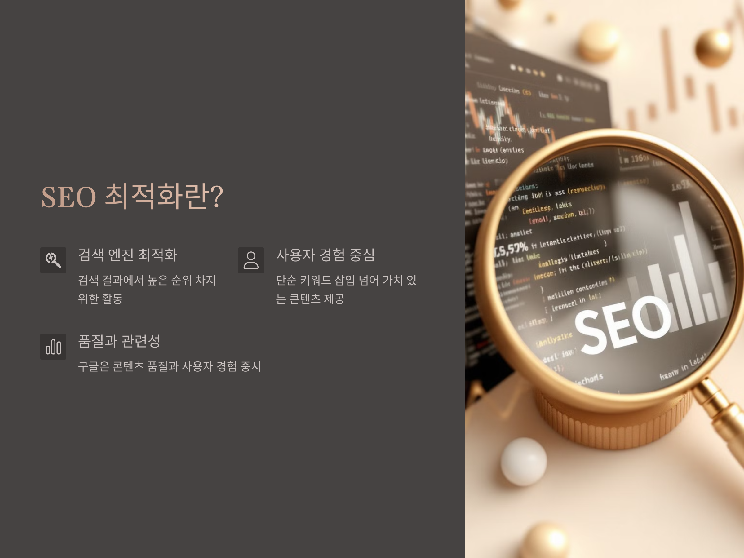SEO 최적화는 검색 엔진 최적화를 의미하며, 웹사이트나 블로그가 검색 엔진 결과에서 높은 순위를 차지하기 위해 필요한 모든 활동을 포함합니다. 구글과 같은 검색 엔진은 사용자의 검색 쿼리와 가장 관련 있는 콘텐츠를 보여주기 위해, 사이트의 품질과 관련성, 그리고 사용자의 경험을 중요한 요소로 봅니다. 이는 단순히 키워드 삽입이나 링크 구축을 넘어서, 사용자에게 가치 있는 콘텐츠를 제공하는 데 중점을 둡니다.