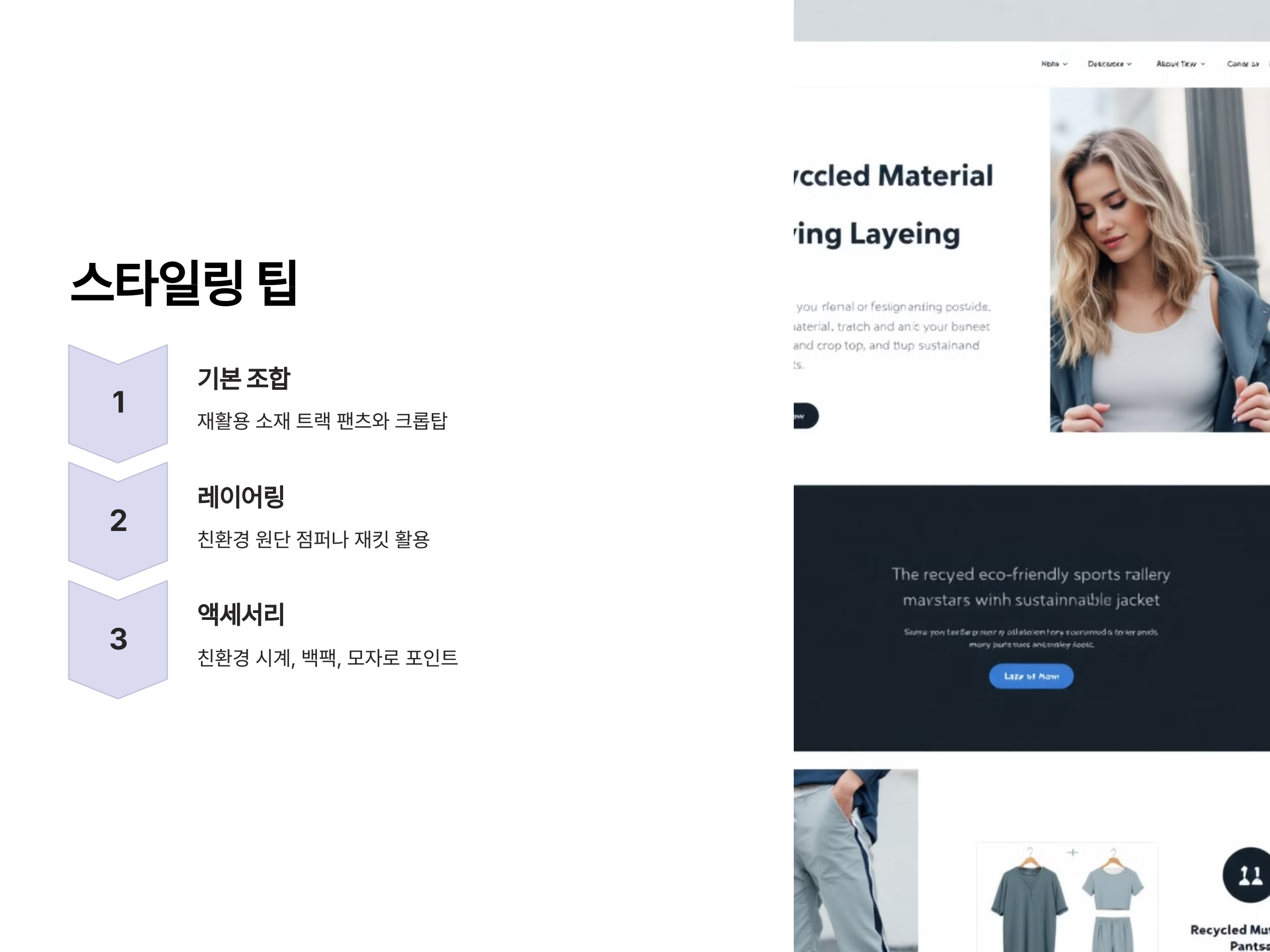 스포티룩을 스타일리시하게 연출하려면, 어떤 아이템들을 조합하는지가 중요합니다. 친환경적인 소재를 사용한 의류가 기본적으로 제공하는 편안함과 기능성을 최대한 살려 스타일링해야 합니다. 예를 들어, 재활용 가능한 소재로 만든 트랙 팬츠와 크롭탑을 조합하거나, 친환경적인 운동화와 함께 활동적인 이미지를 강조할 수 있습니다.