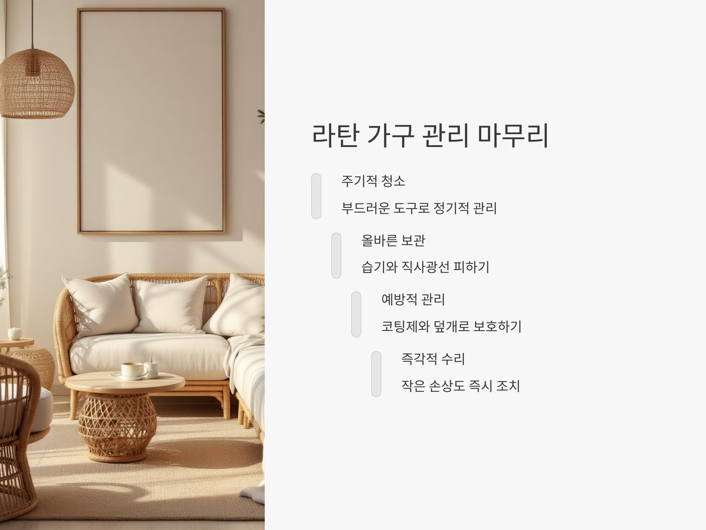 라탄 가구를 잘 관리하여 오래도록 그 매력을 느껴보세요! 그리고 이 관리법들을 통해 여러분의 라탄 가구가 오래도록 멋진 상태로 유지되길 바랍니다.