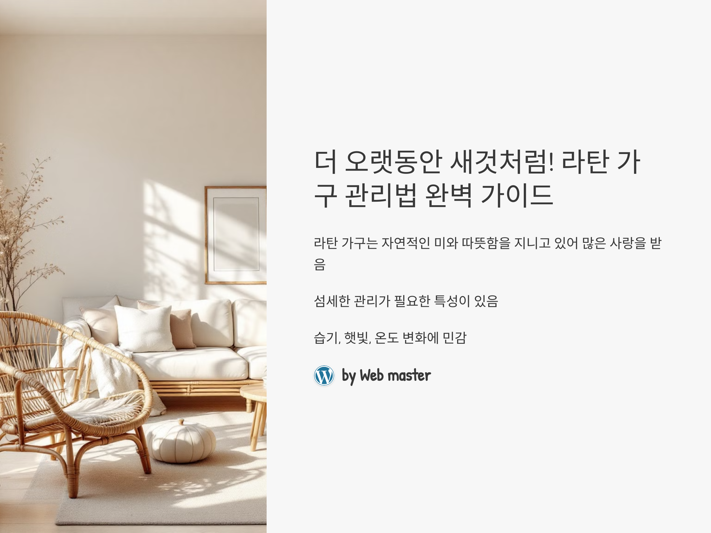 라탄 가구는 자연적인 미와 따뜻함을 지니고 있어 많은 사람들의 사랑을 받습니다. 그러나 라탄 가구는 다른 가구와 달리 섬세한 관리가 필요한 특성이 있습니다. 제대로 관리하지 않으면 쉽게 손상될 수 있기 때문에, 라탄 가구의 아름다움을 오래도록 유지하려면 어떻게 관리해야 할지 정확히 아는 것이 중요합니다. 이번 포스팅에서는 라탄 가구를 오래 사용하고 유지하는 법에 대해 알아보겠습니다.