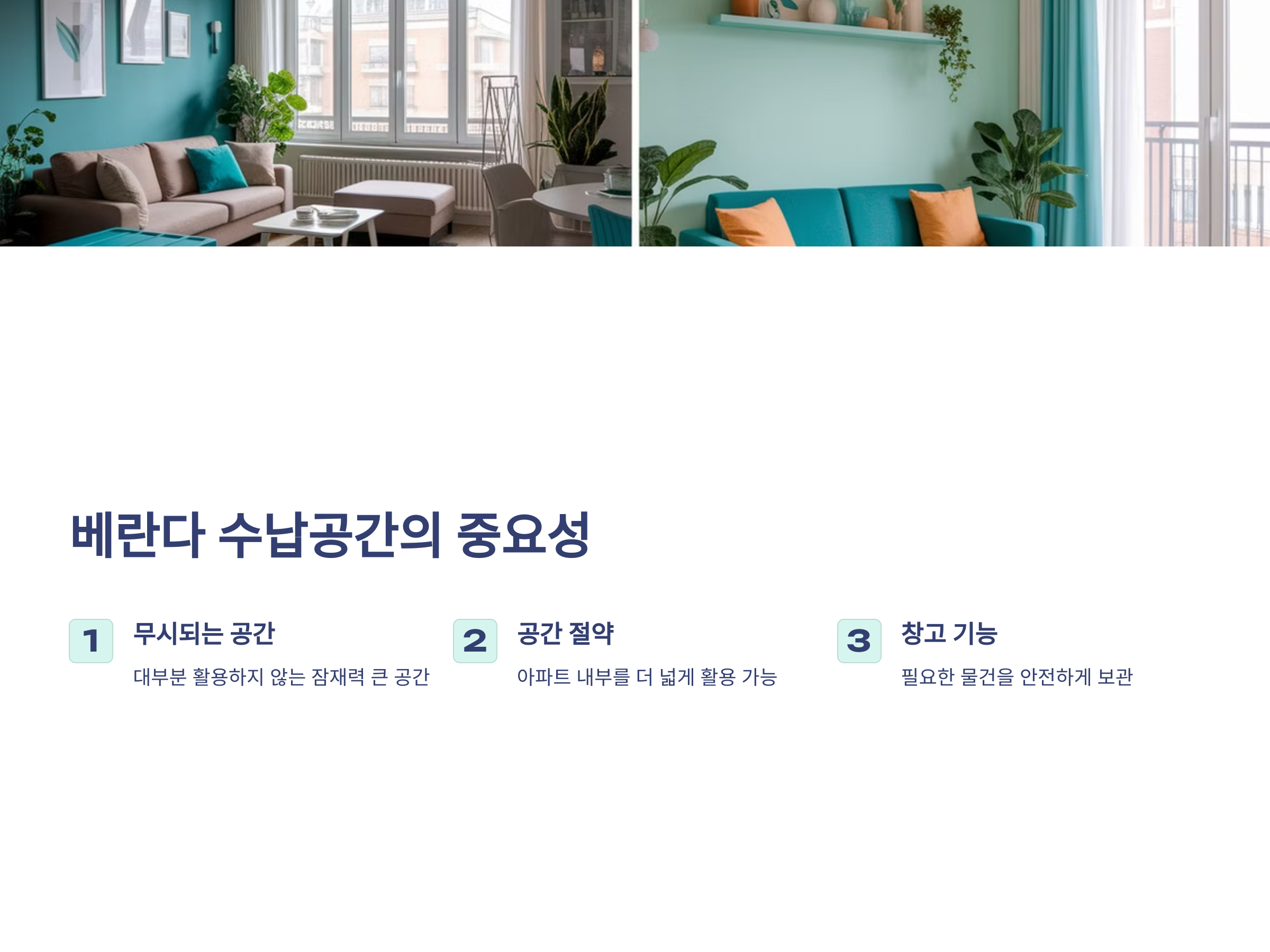베란다를 수납공간으로 활용하는 이유는 단순히 공간을 절약하는 데 그치지 않습니다. 베란다는 외부와의 연결이 있지만, 대부분의 아파트에서 기후가 온화한 지역에 위치해 있습니다. 그래서 적당한 수납공간을 만들어 실외와 실내를 구분지으면서도 필요한 물건을 안전하게 보관할 수 있습니다. 베란다를 창고처럼 활용하면 집 안의 공간을 더욱 깔끔하고 넓게 쓸 수 있습니다.