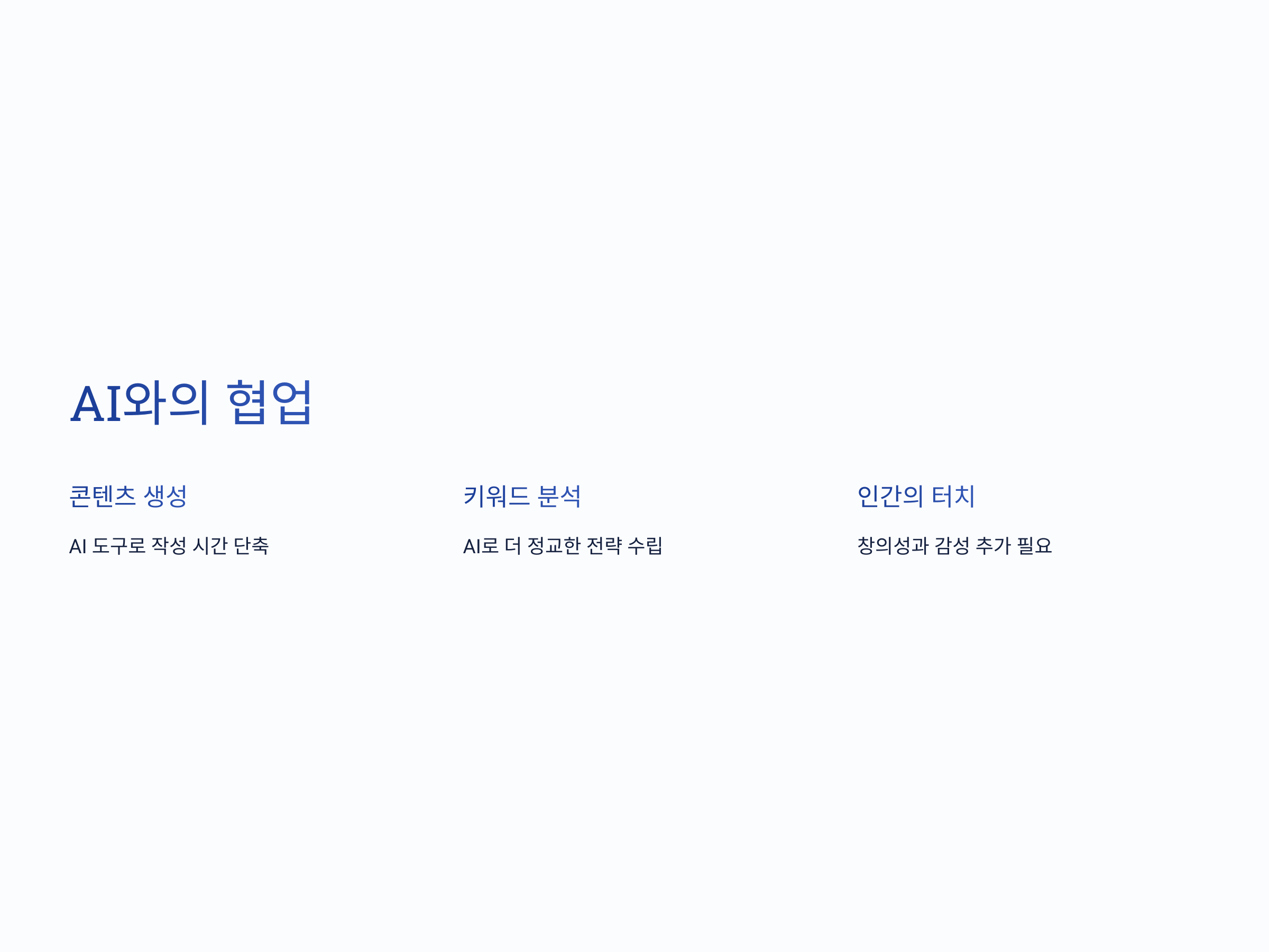 그러나 AI가 생성한 콘텐츠는 반드시 인간의 손길이 필요합니다. AI는 창의적인 접근이나 감성적인 터치를 덧붙이지 못하기 때문에, 블로그 운영자는 AI의 도움을 받되, 최종 콘텐츠는 사람의 감각으로 수정하고 보강해야 합니다. 또한, AI가 제공하는 SEO 분석 도구를 활용해 더 정교한 키워드 연구와 콘텐츠 전략을 수립할 수 있습니다.
