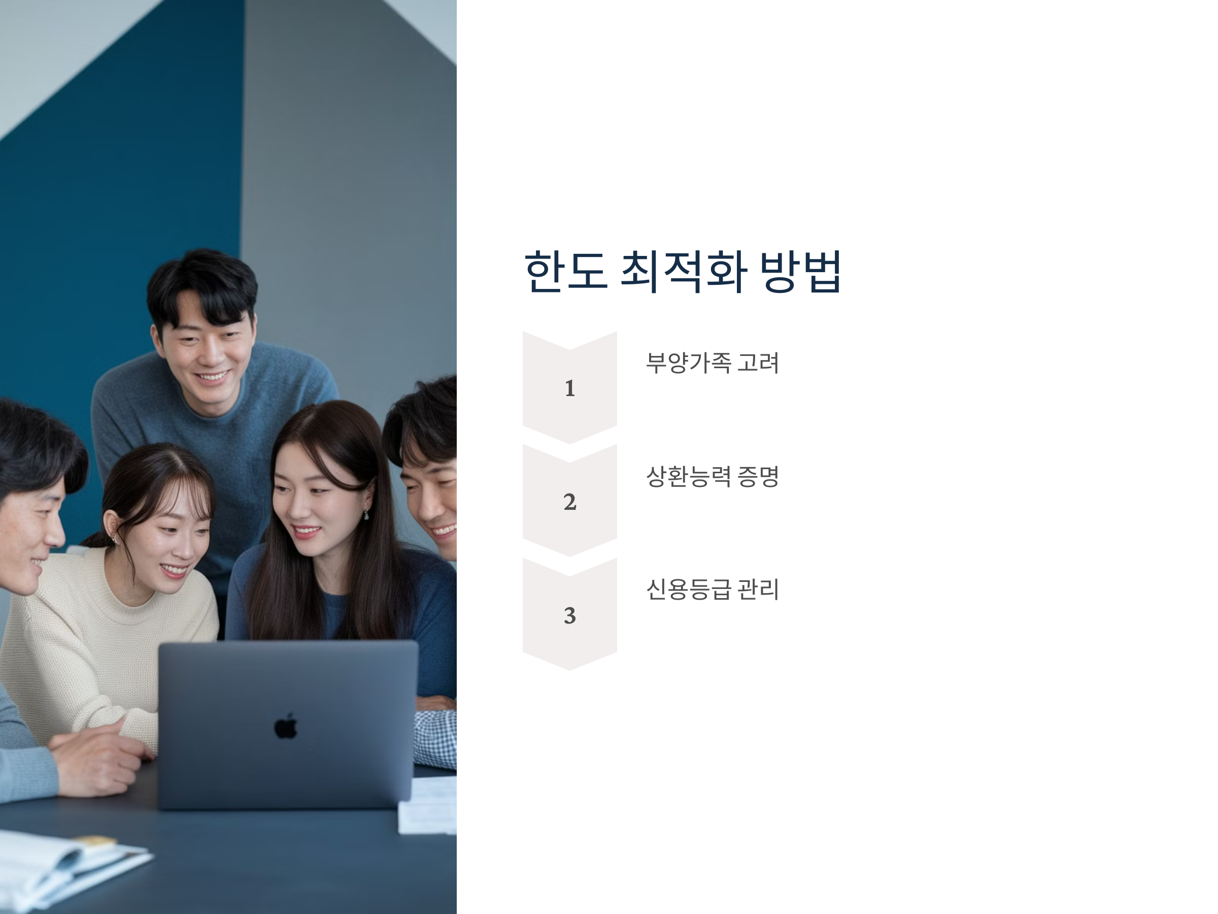 네, 맞습니다. 부양가족이 있을 경우 대출자의 소득이 높게 인정되어 대출 한도를 더 높일 수 있습니다. 부양가족 수를 정확히 신고하여 최적의 대출 한도를 받는 것이 중요합니다.