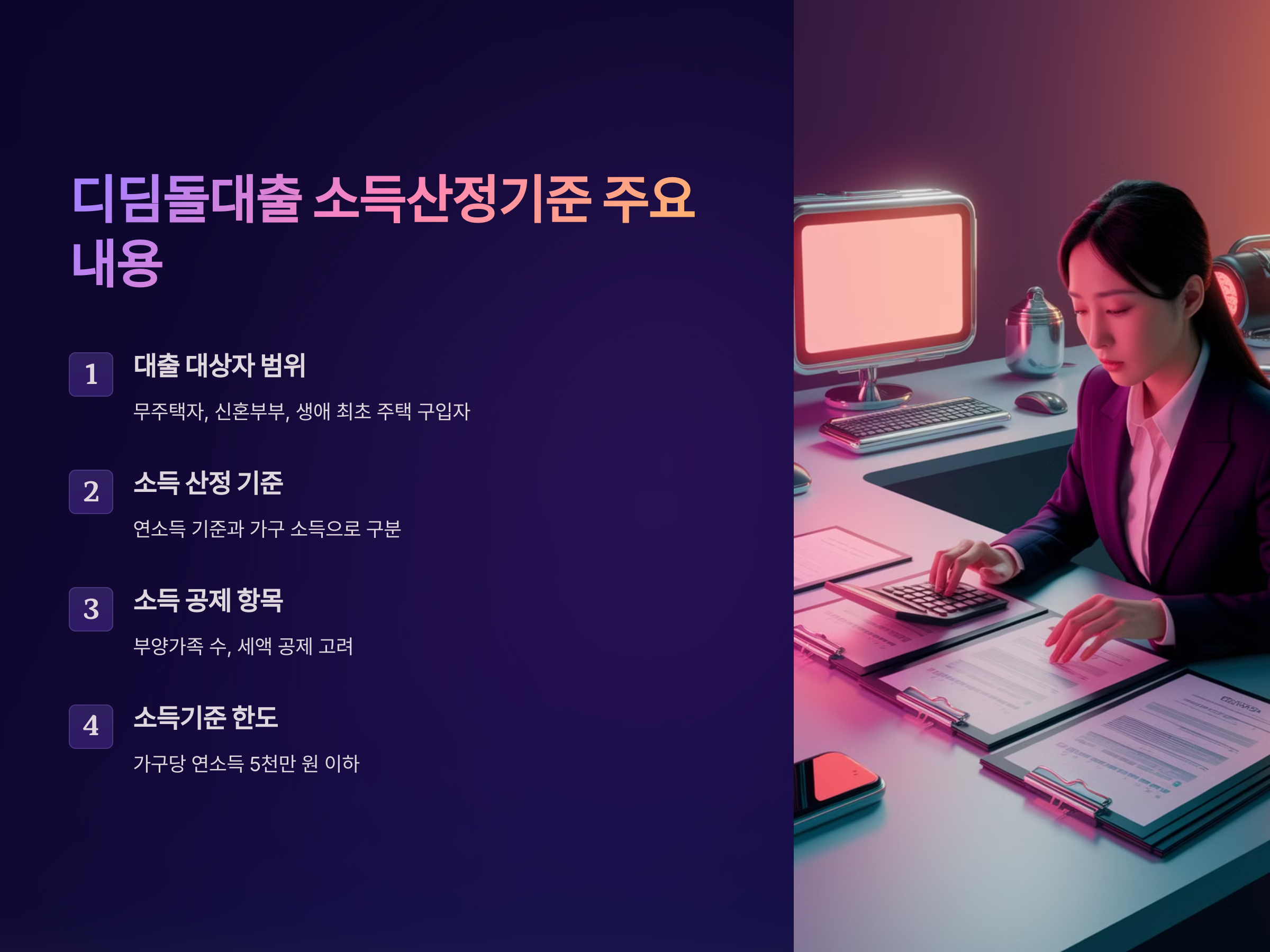 디딤돌대출은 무주택자, 신혼부부, 생애 최초 주택 구입자 등 특정 조건에 해당하는 사람들에게 제공됩니다. 이 범위에 해당되면 소득 산정 기준을 충족하는지 확인이 필요합니다.