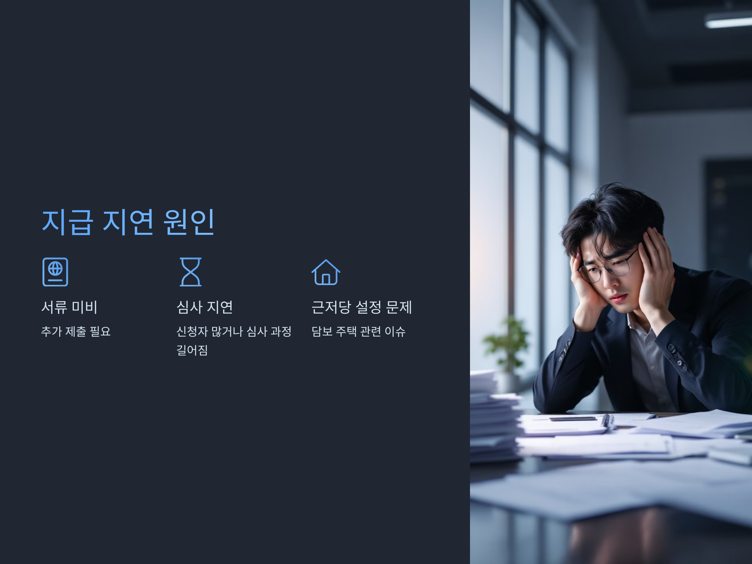 A. 서류 미비, 심사 지연, 근저당 설정 문제 등이 주요 원인입니다.