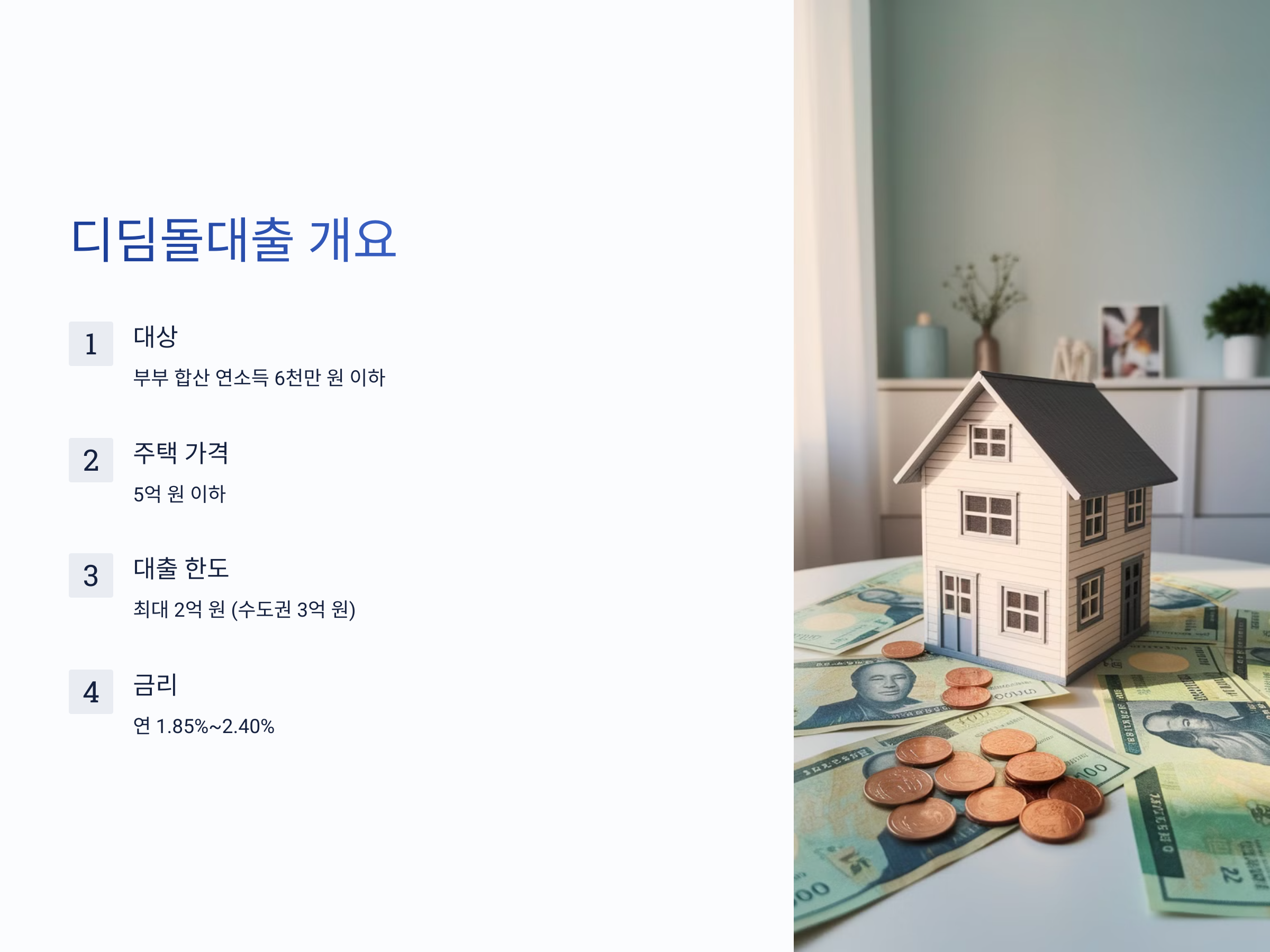- 대상: 부부 합산 연소득 6천만 원 이하 (신혼부부 및 다자녀 가구는 7천만 원 이하)
