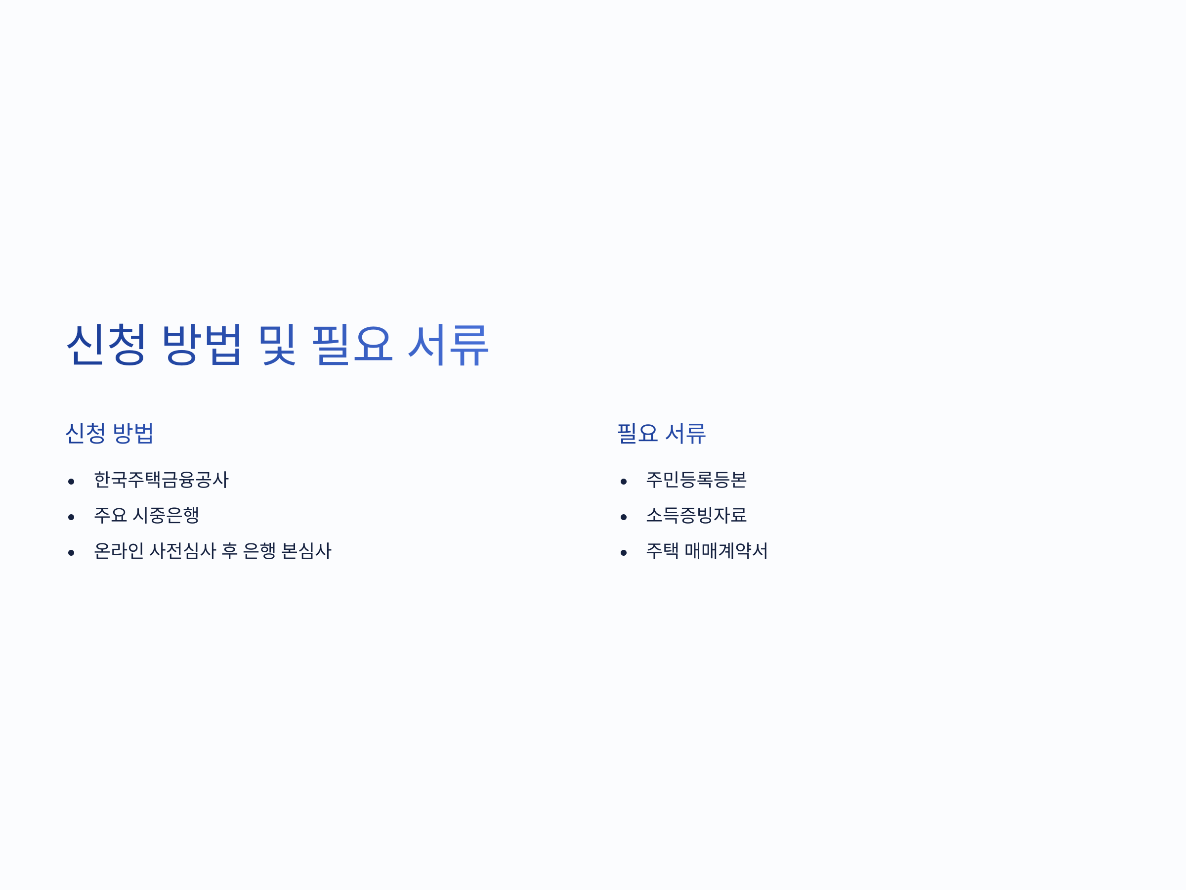 - 한국주택금융공사, 우리은행, 국민은행, 신한은행 등에서 신청 가능
