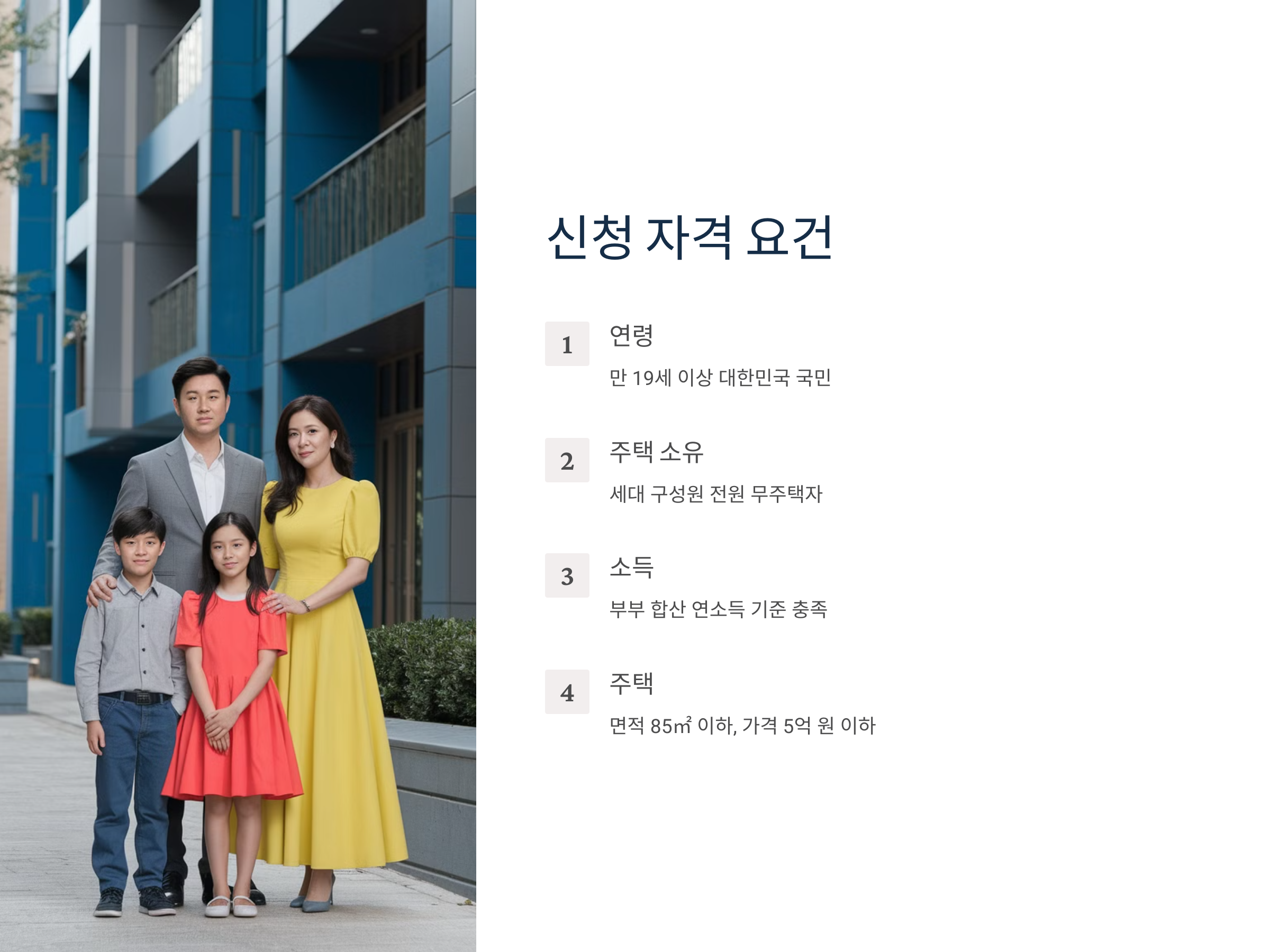 - 주택 소유 여부: 본인과 배우자를 포함한 세대 구성원 전원이 무주택자