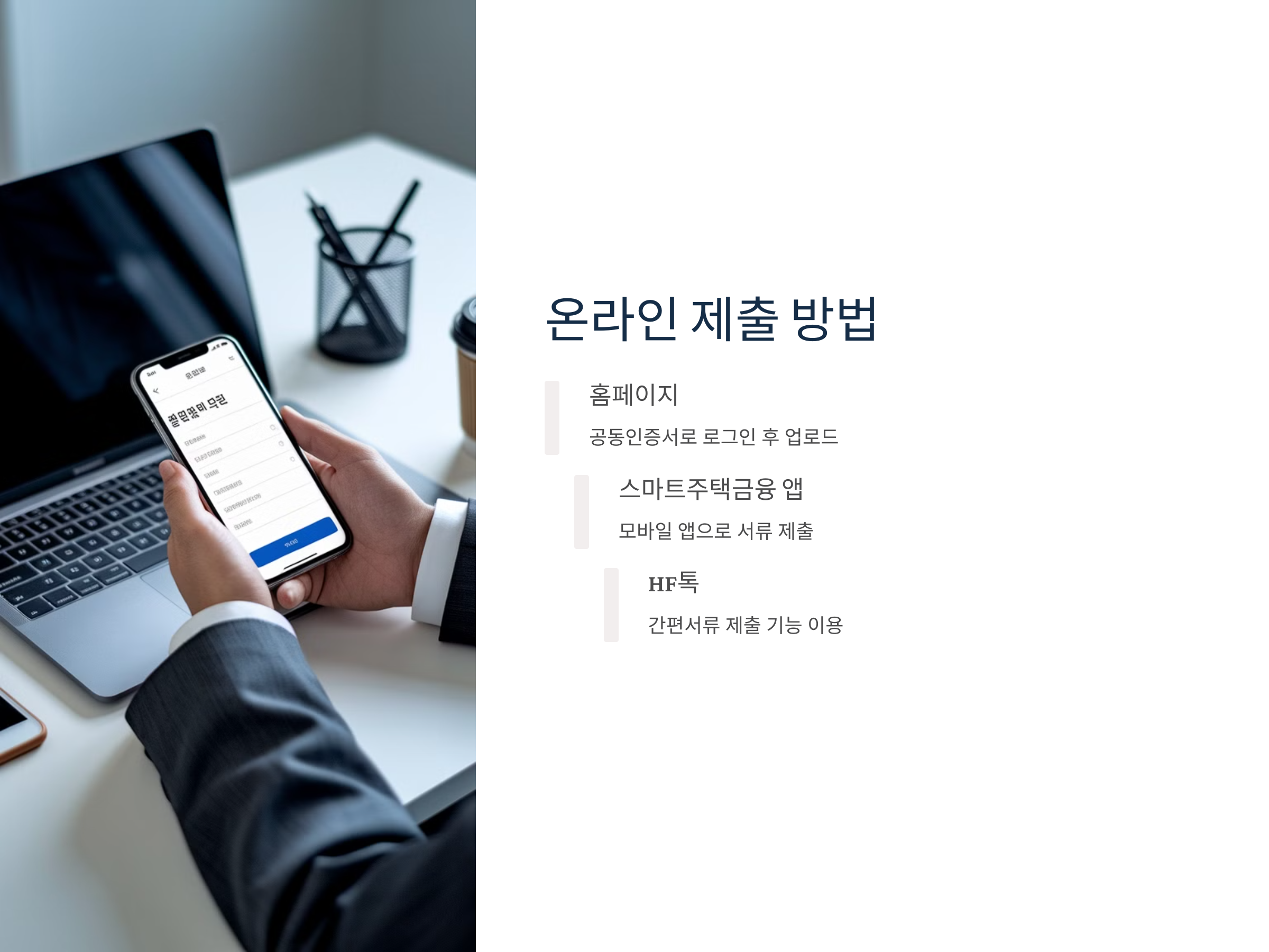 - 스마트주택금융 앱: 모바일 앱을 통해 서류를 제출할 수 있습니다.