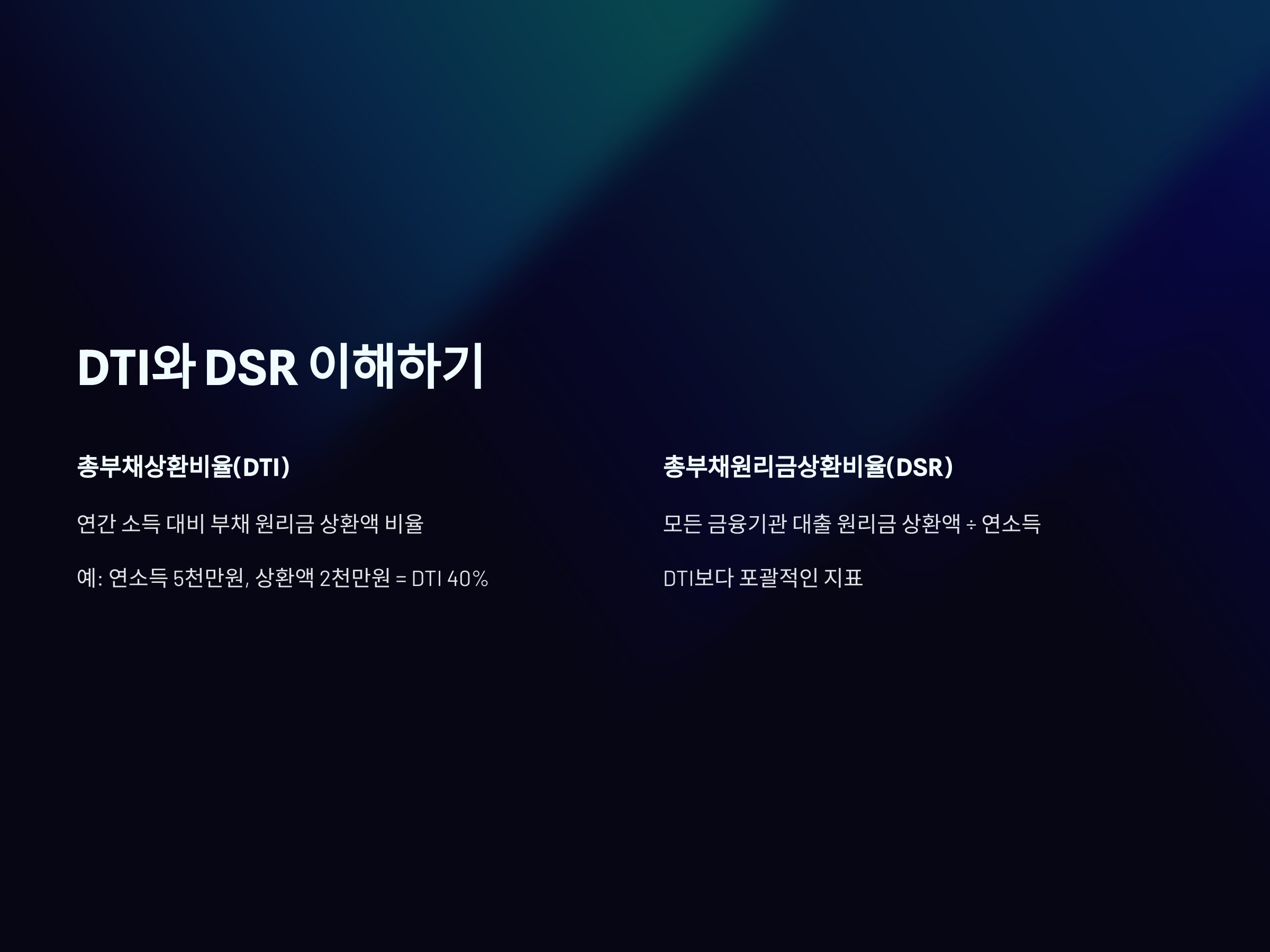 - 총부채원리금상환비율(DSR): 모든 금융기관에서 받은 대출의 원리금 상환액을 연소득으로 나눈 비율입니다. 이는 DTI보다 포괄적인 지표로, 최근 금융 당국이 중요하게 고려하는 지표입니다.