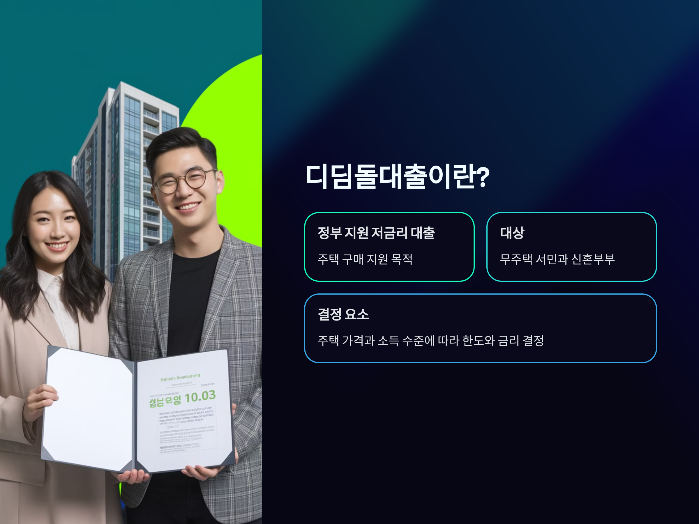 디딤돌대출은 정부에서 주택 구매를 지원하기 위해 제공하는 저금리 대출 상품입니다. 주로 무주택 서민과 신혼부부를 대상으로 하며, 주택 가격과 소득 수준에 따라 대출 한도와 금리가 결정됩니다. 이를 통해 주택 구매 시 초기 자금 부담을 완화할 수 있습니다.