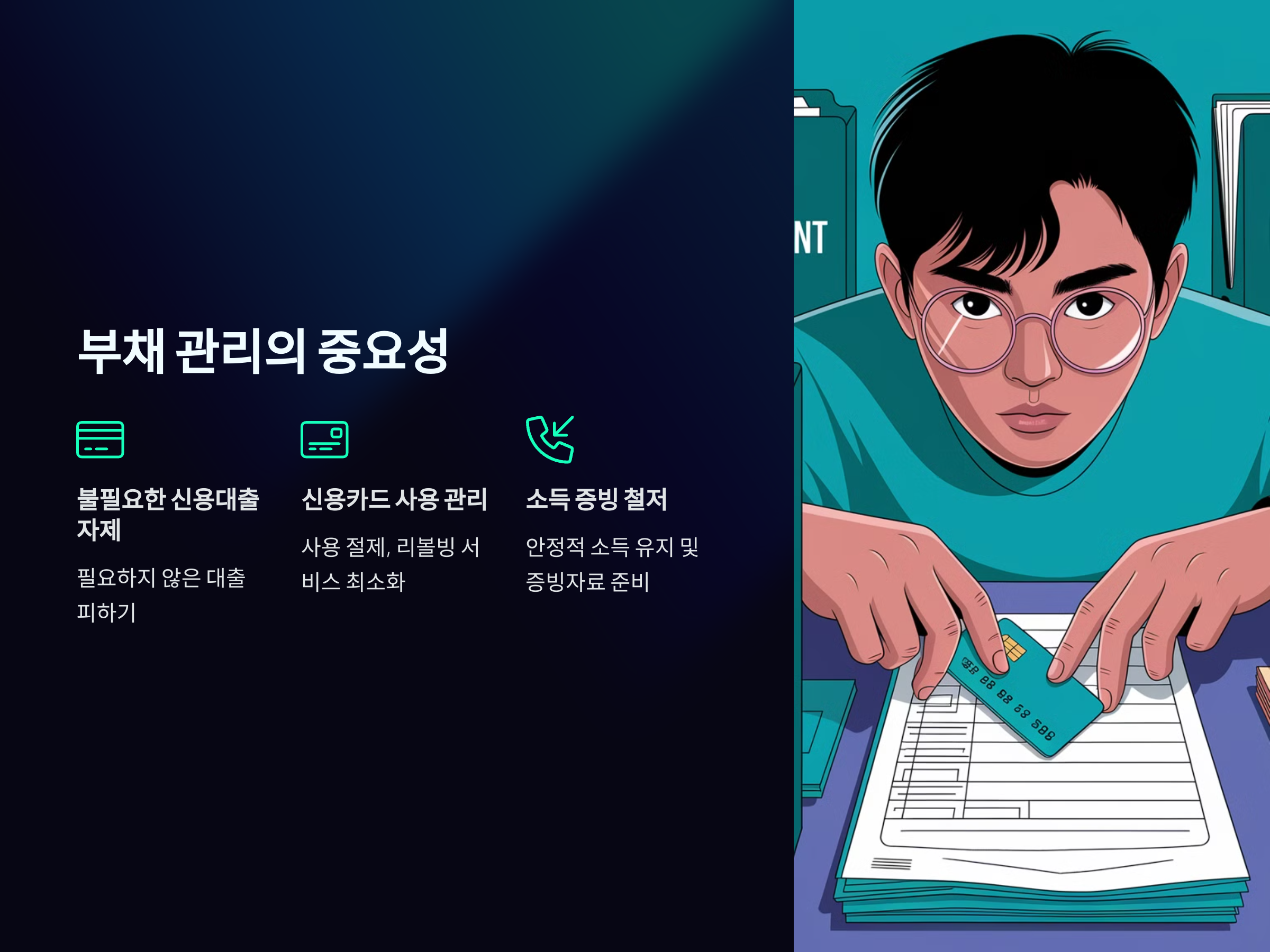 - 신용카드 사용 관리: 신용카드 사용을 절제하고, 리볼빙 서비스 이용을 최소화합니다.