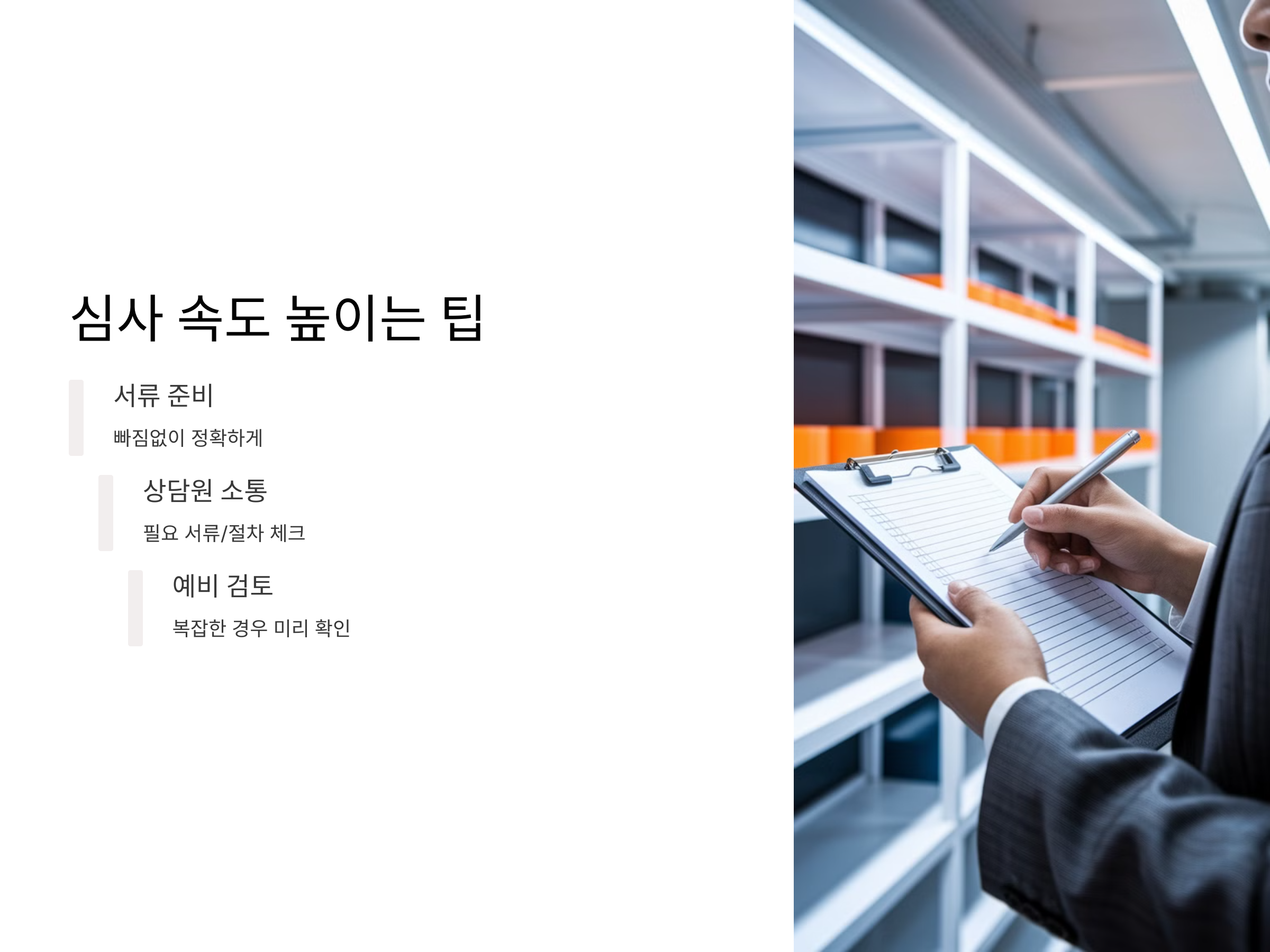 서류가 정확하게 준비되어 있을 경우, 심사 속도가 빨라집니다. 서류에 부족한 부분이 있거나 추가로 요구되는 서류가 있을 경우 심사 속도가 지연될 수 있습니다. 서류를 준비할 때 빠짐없이 꼼꼼히 확인하는 것이 중요합니다.