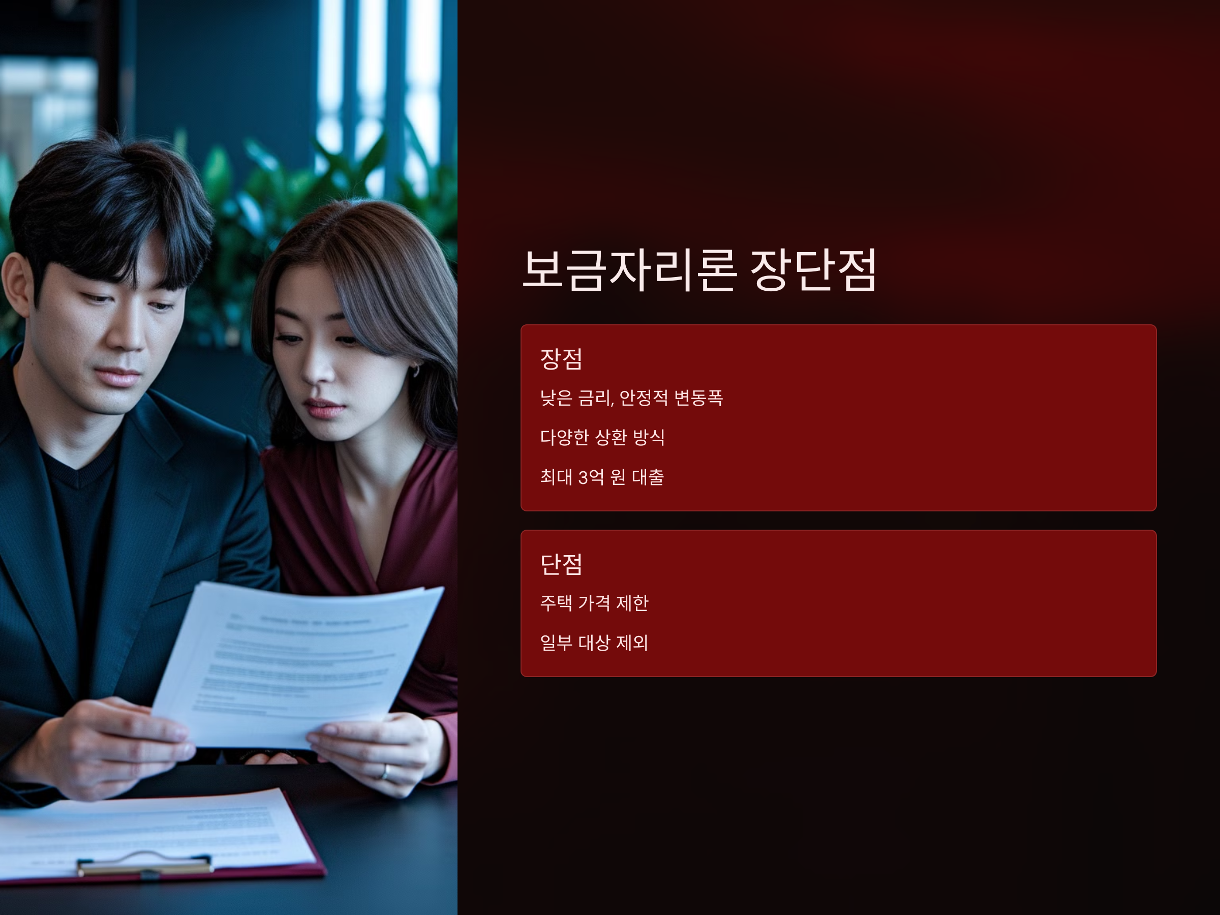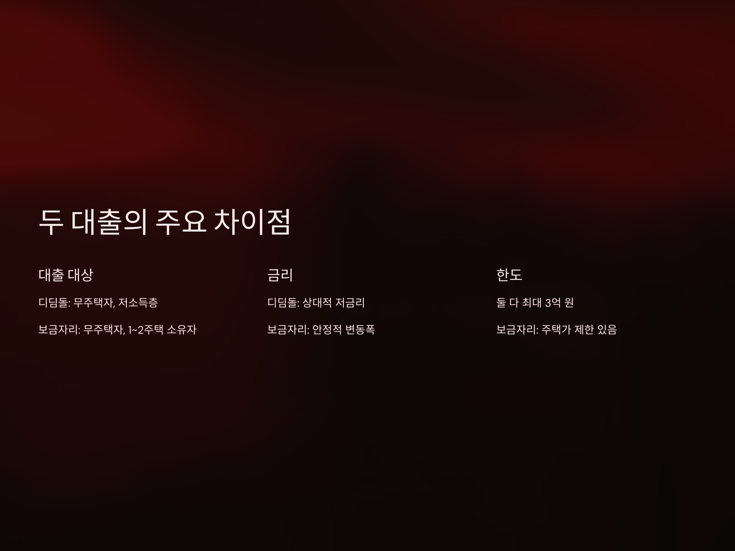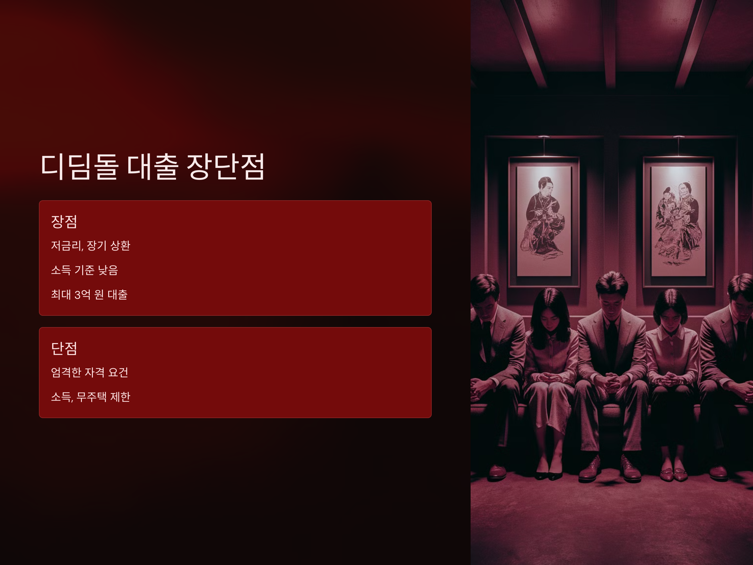 - 대출 자격 요건이 엄격하고, 소득 수준이나 무주택자 여부 등 제한이 있을 수 있습니다.