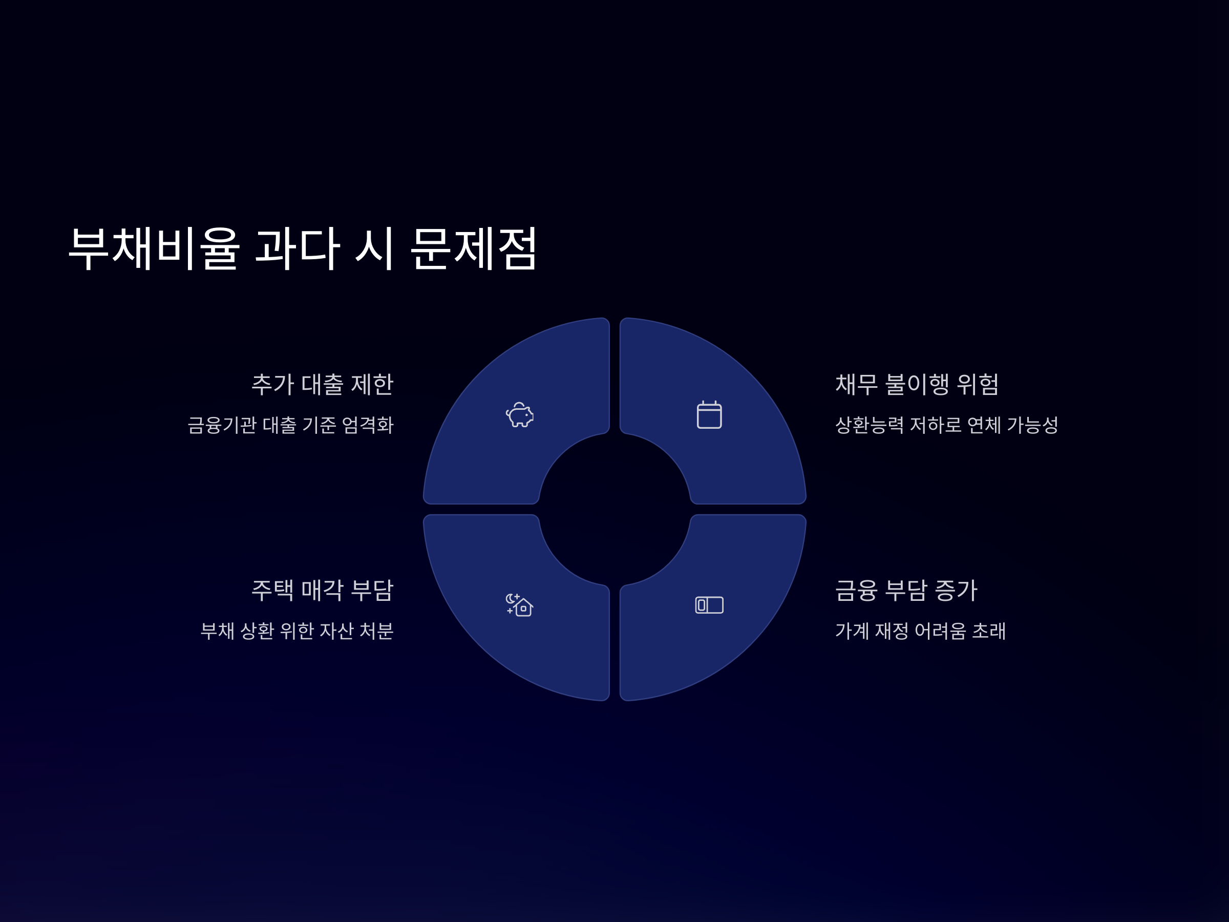 부채비율이 높아지면 금융적인 부담이 커지며, 이는 결국 가계의 재정적인 어려움을 초래할 수 있습니다. 이러한 위험을 피하기 위해서는 부채비율을 꾸준히 관리하고, 재정적인 계획을 세워서 대출을 받는 것이 중요합니다.