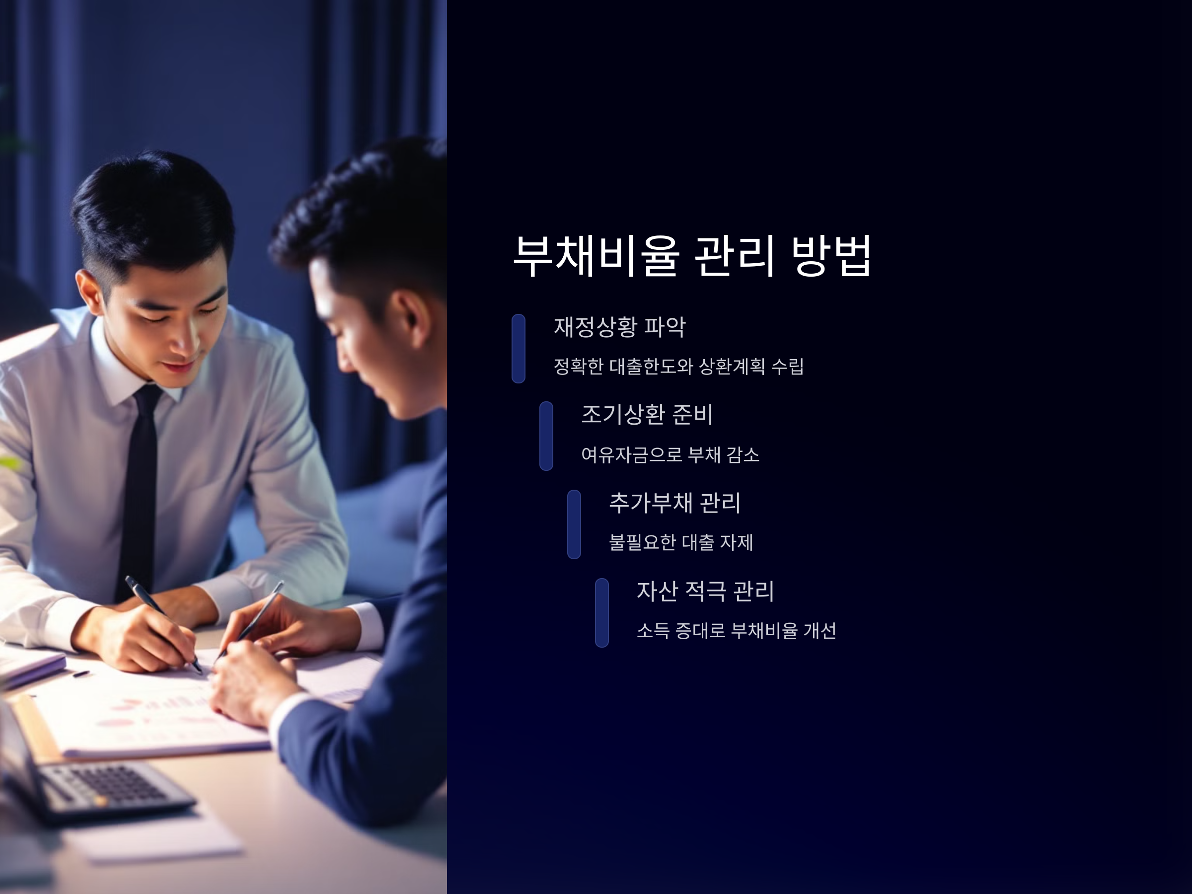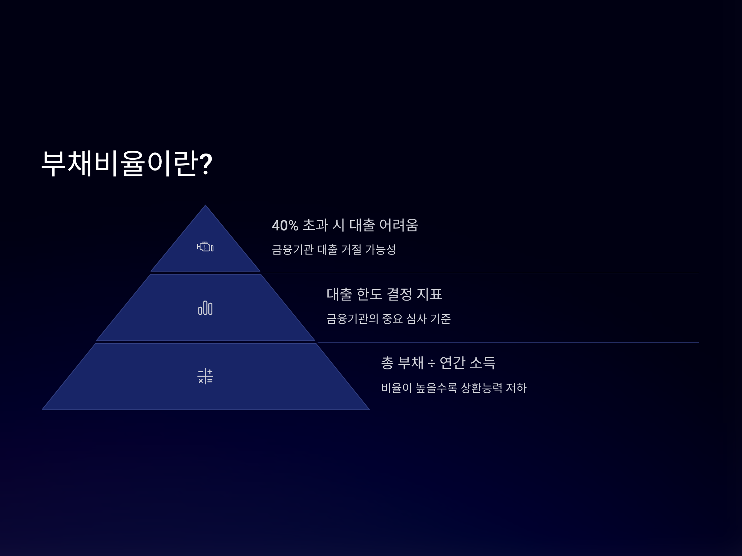 부채비율은 개인이나 가구의 총 부채를 연간 소득으로 나누어 계산한 비율로, 이 비율이 높을수록 상환 능력이 낮아지고, 채무 불이행의 위험도 커집니다. 금융기관은 부채비율을 중요한 지표로 삼고, 이를 바탕으로 대출 한도를 결정합니다. 일반적으로 부채비율이 40%를 초과하면 대출을 받기 어려운 상황이 될 수 있습니다.