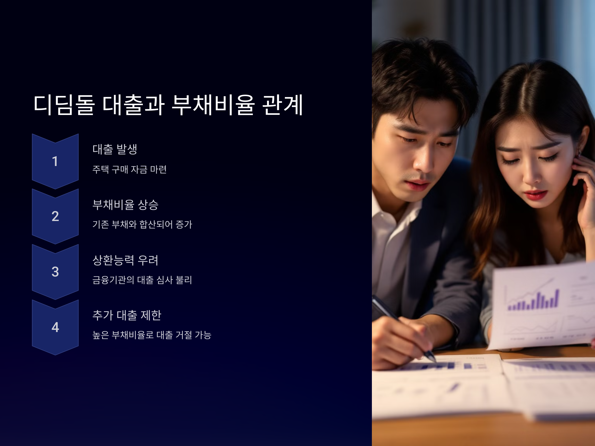 부채비율이 높아지면, 금융기관은 상환 능력을 우려하여 대출을 거절하거나, 대출 금액을 축소할 수 있습니다. 또한 부채비율이 높은 상태에서 추가 대출을 받기 어려운 상황이 될 수 있습니다. 따라서 디딤돌 대출을 고려할 때, 기존의 부채와 합산하여 부채비율이 지나치게 높아지지 않도록 신중히 계획해야 합니다.