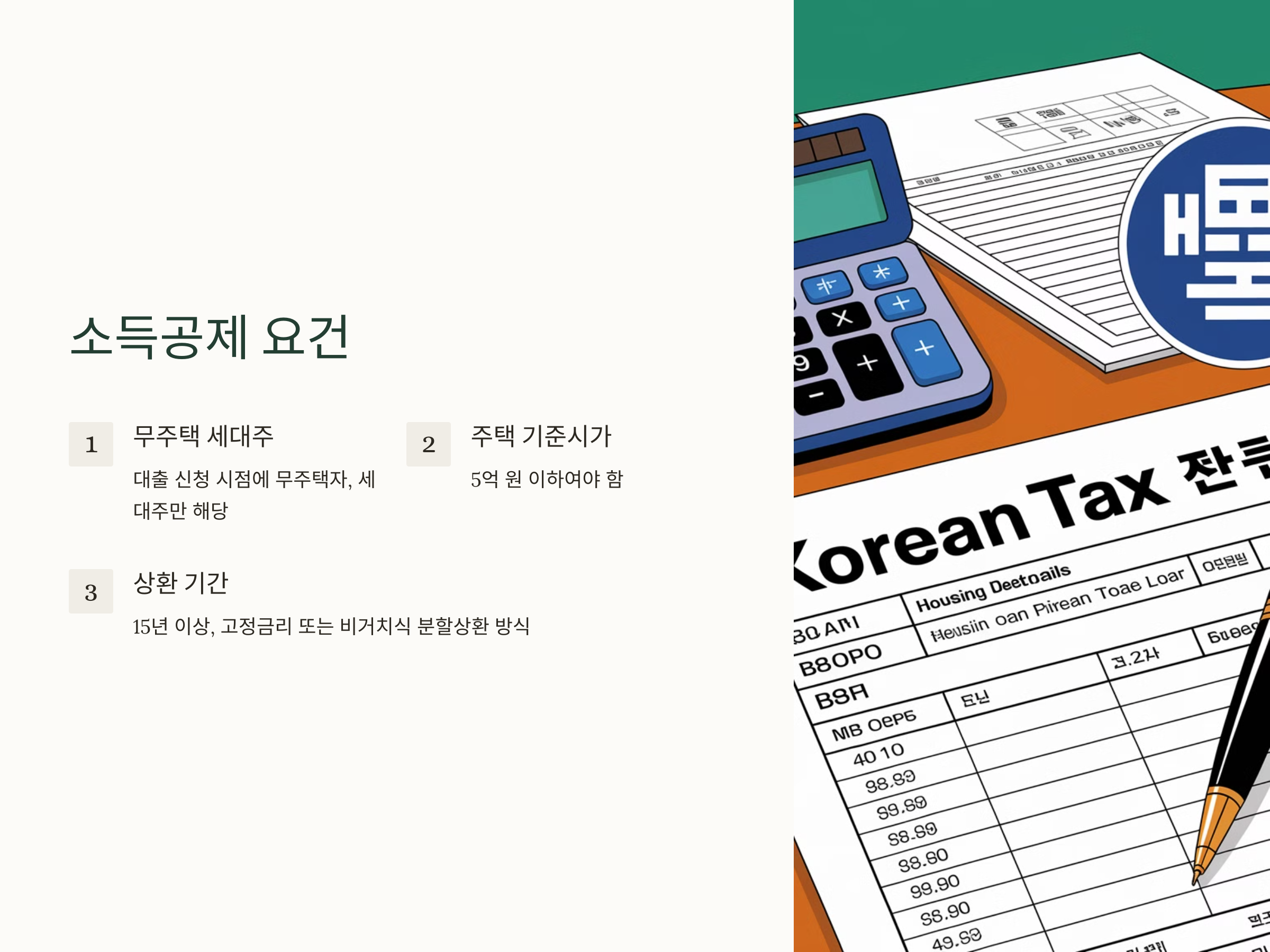 - 주택 기준시가 5억 원 이하: 대출 당시 주택의 기준시가가 5억 원을 초과하지 않아야 합니다.