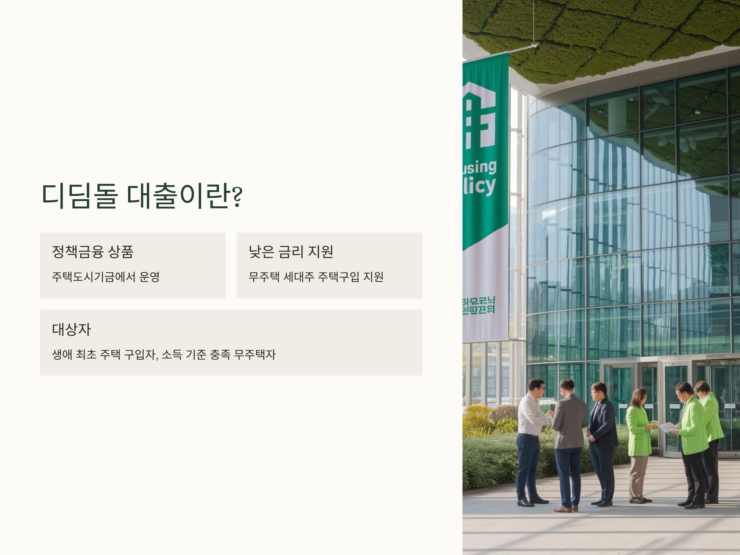 디딤돌 대출은 주택도시기금에서 운영하는 정책금융 상품으로, 무주택 세대주가 낮은 금리로 주택을 구입할 수 있도록 지원하는 대출입니다. 주택 구매를 원하는 무주택자와 저소득층을 위해 정부에서 지원하는 금융 상품으로, 생애 최초 주택 구입자나 소득 기준을 충족하는 무주택자가 이용할 수 있습니다. citeturn0search4