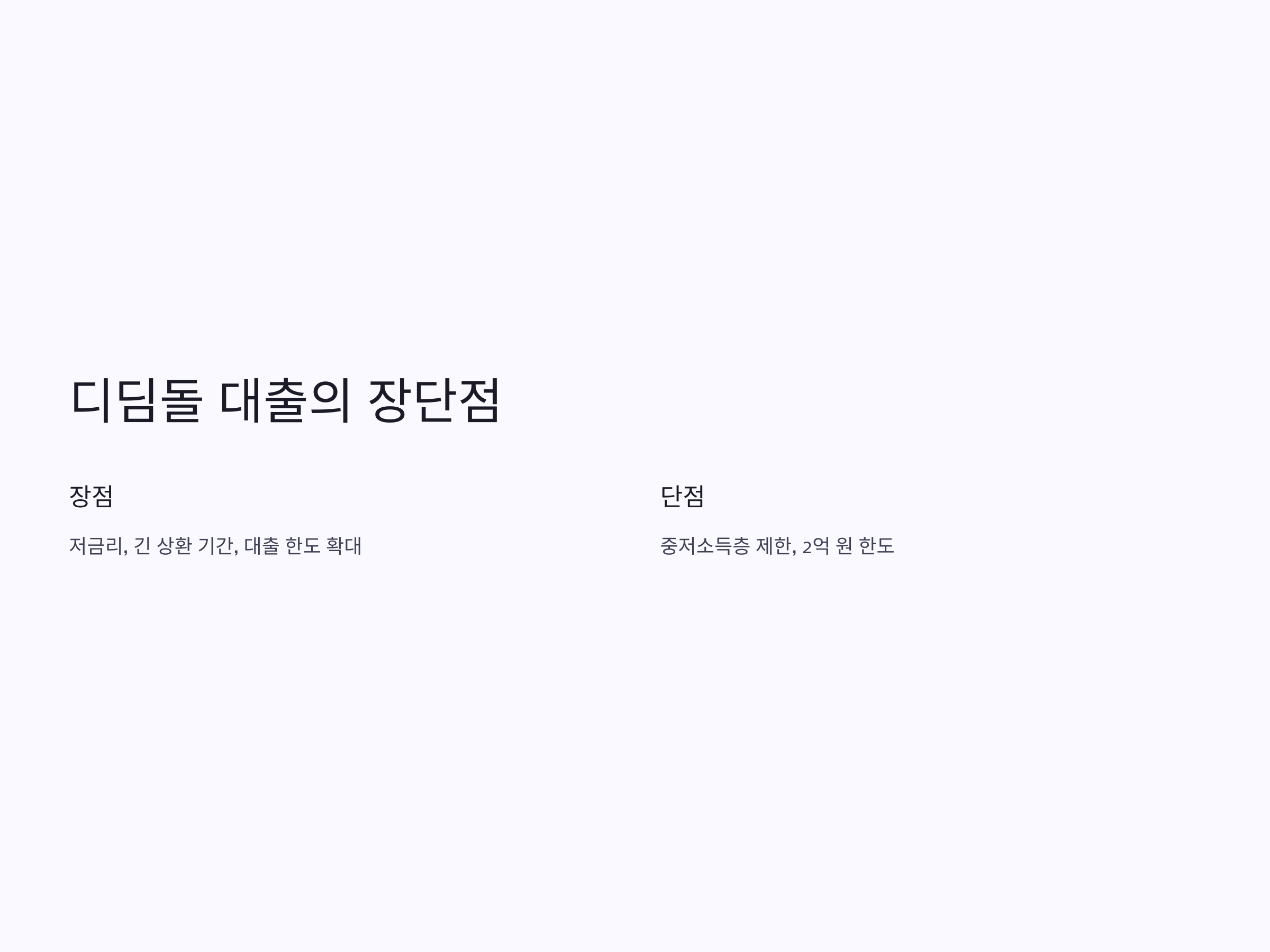 하지만 디딤돌 대출에도 한계가 있습니다. 예를 들어, 대출 대상이 중저소득층으로 제한되어 있기 때문에, 소득 수준이나 자산이 일정 기준 이상인 사람들은 대출을 받을 수 없습니다. 또한, 대출 한도가 2억 원으로 한정되어 있기 때문에, 고급 아파트나 고가의 주택을 구매하려는 사람에게는 불편할 수 있습니다.