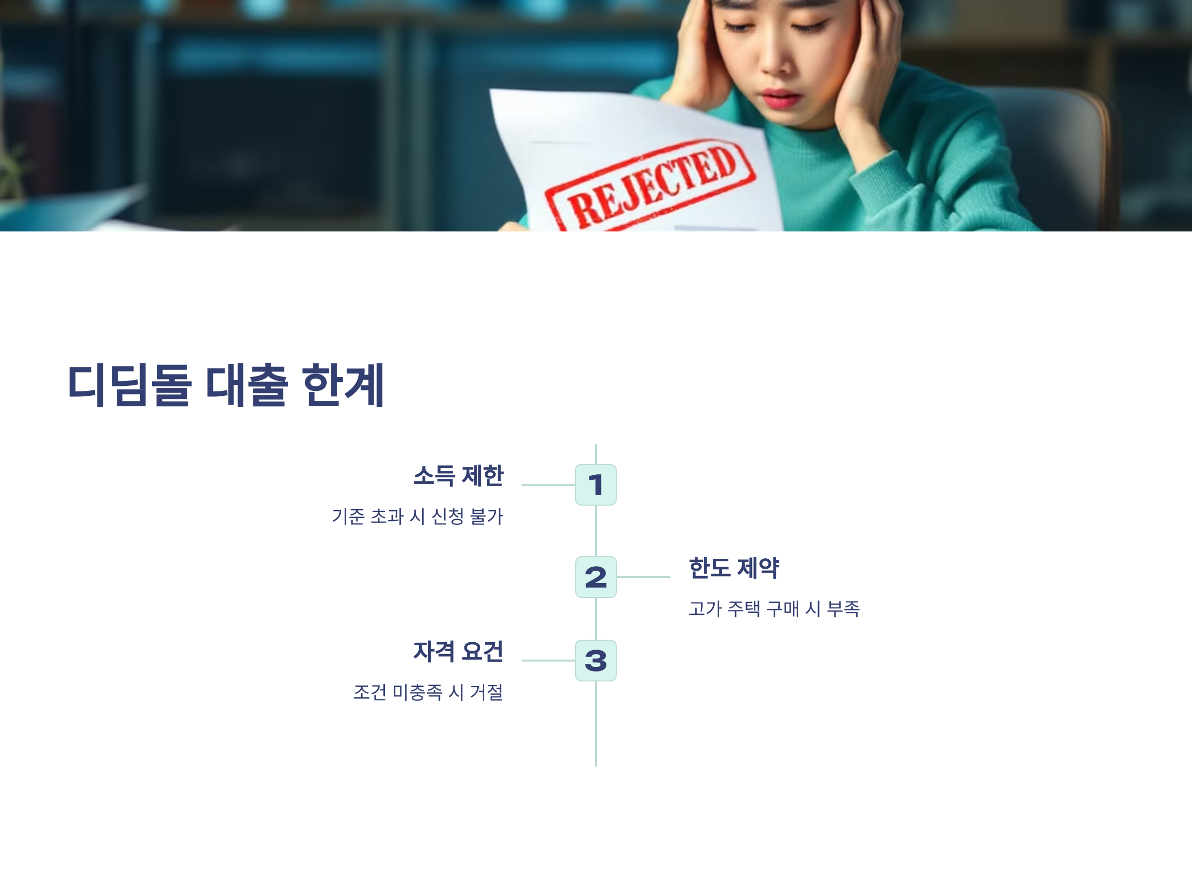 하지만 대출 한도가 낮거나, 소득 기준을 초과할 경우 대출 신청이 불가능할 수 있습니다. 따라서 신청 전 본인의 조건을 꼼꼼히 확인해야 하며, 조건에 맞는 대출 상품을 선택하는 것이 중요합니다.