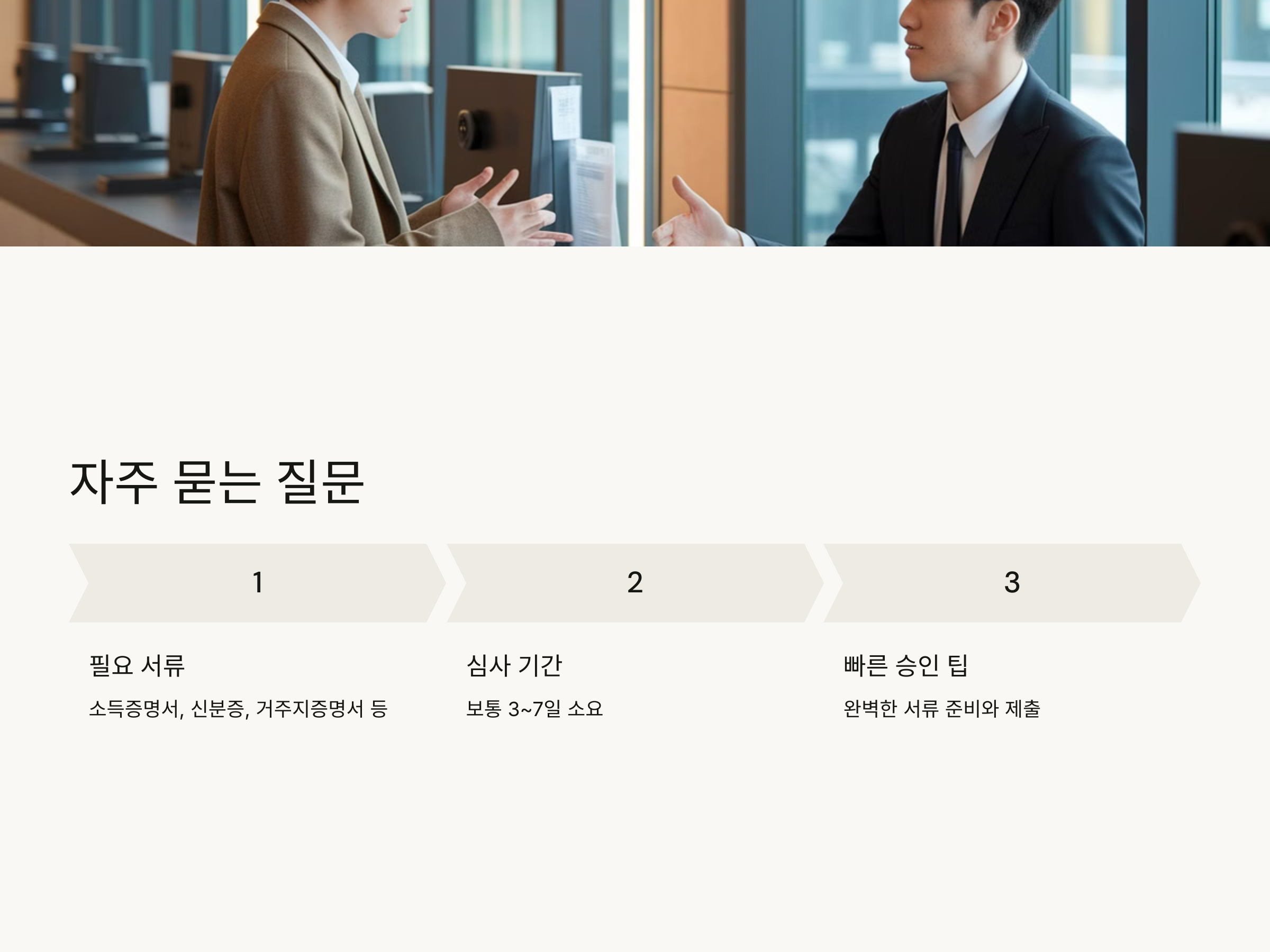 - 정확한 정보 제공: 대출 신청 시 제공하는 정보가 정확하면 심사 과정에서의 추가적인 확인 절차가 줄어들어 심사 속도가 빨라질 수 있습니다.