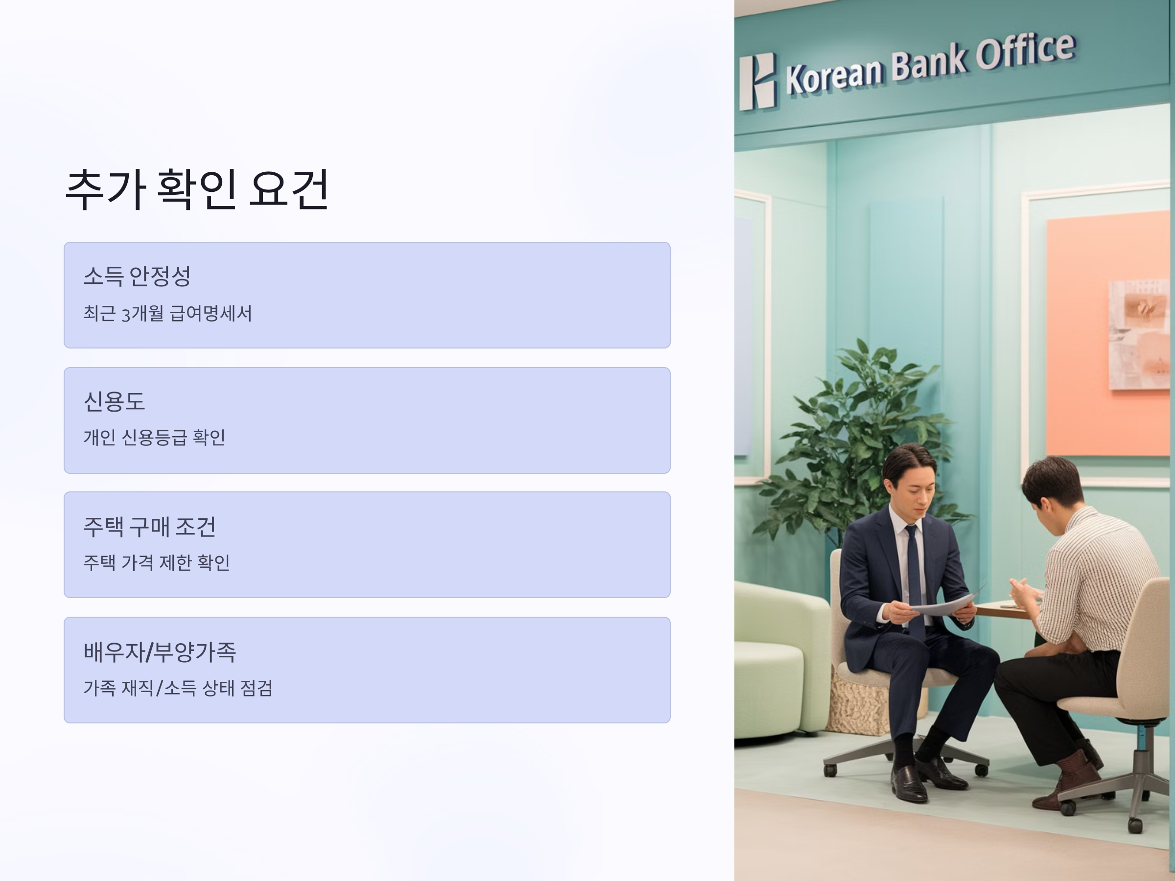 디딤돌 대출을 신청하기 전에 재직기간 외에도 확인해야 할 몇 가지 중요한 요건이 있습니다. 이 요건들을 충족해야 대출 승인이 원활하게 이루어질 수 있습니다.