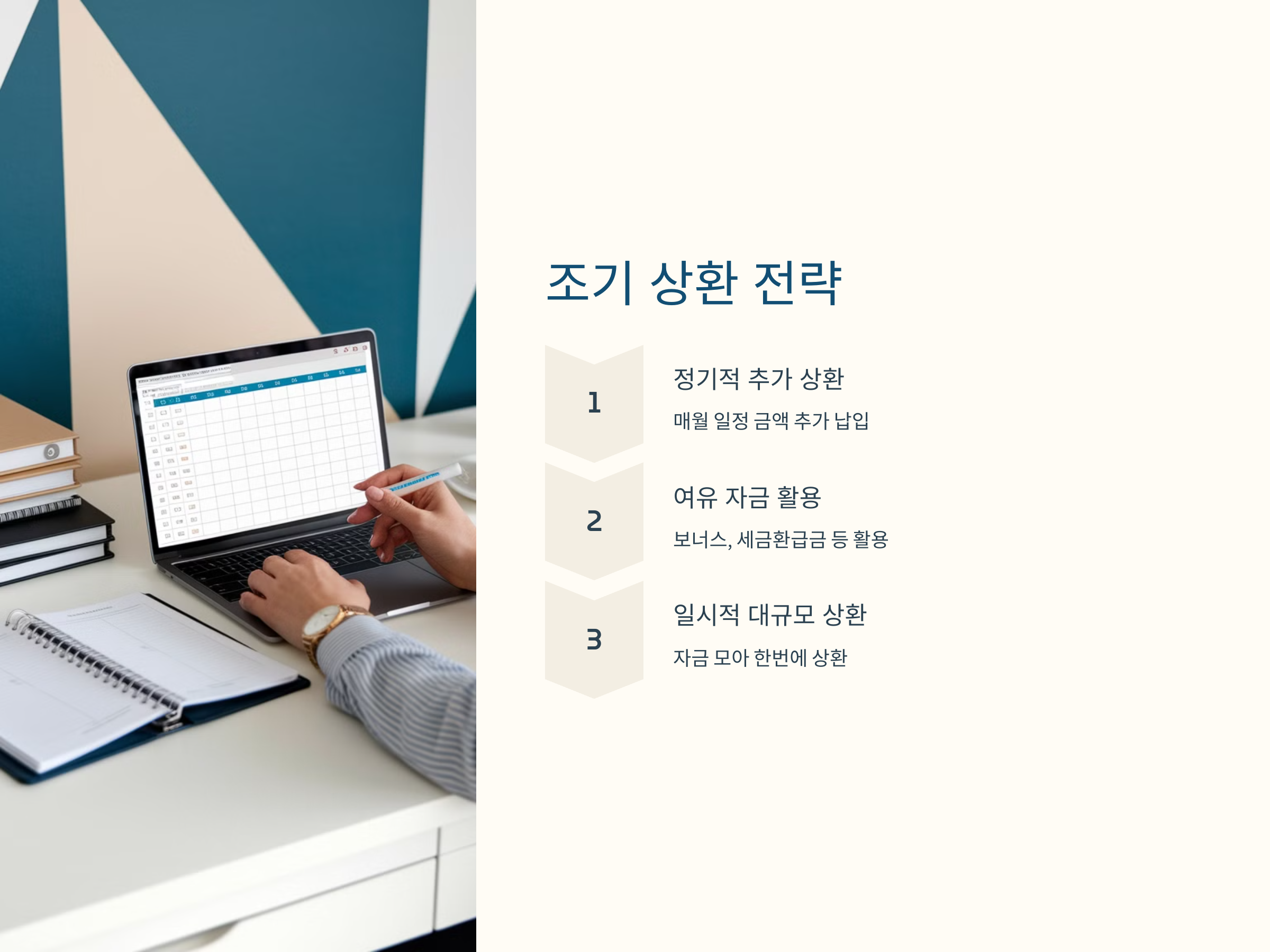 둘째는 여유 자금이 생길 때마다 추가로 상환하는 방법입니다. 예를 들어, 보너스나 세금 환급, 금융 상품으로 얻은 수익 등을 대출 상환에 활용하는 방법입니다. 이런 방법은 자금이 한정적일 때 유용하게 활용할 수 있습니다.