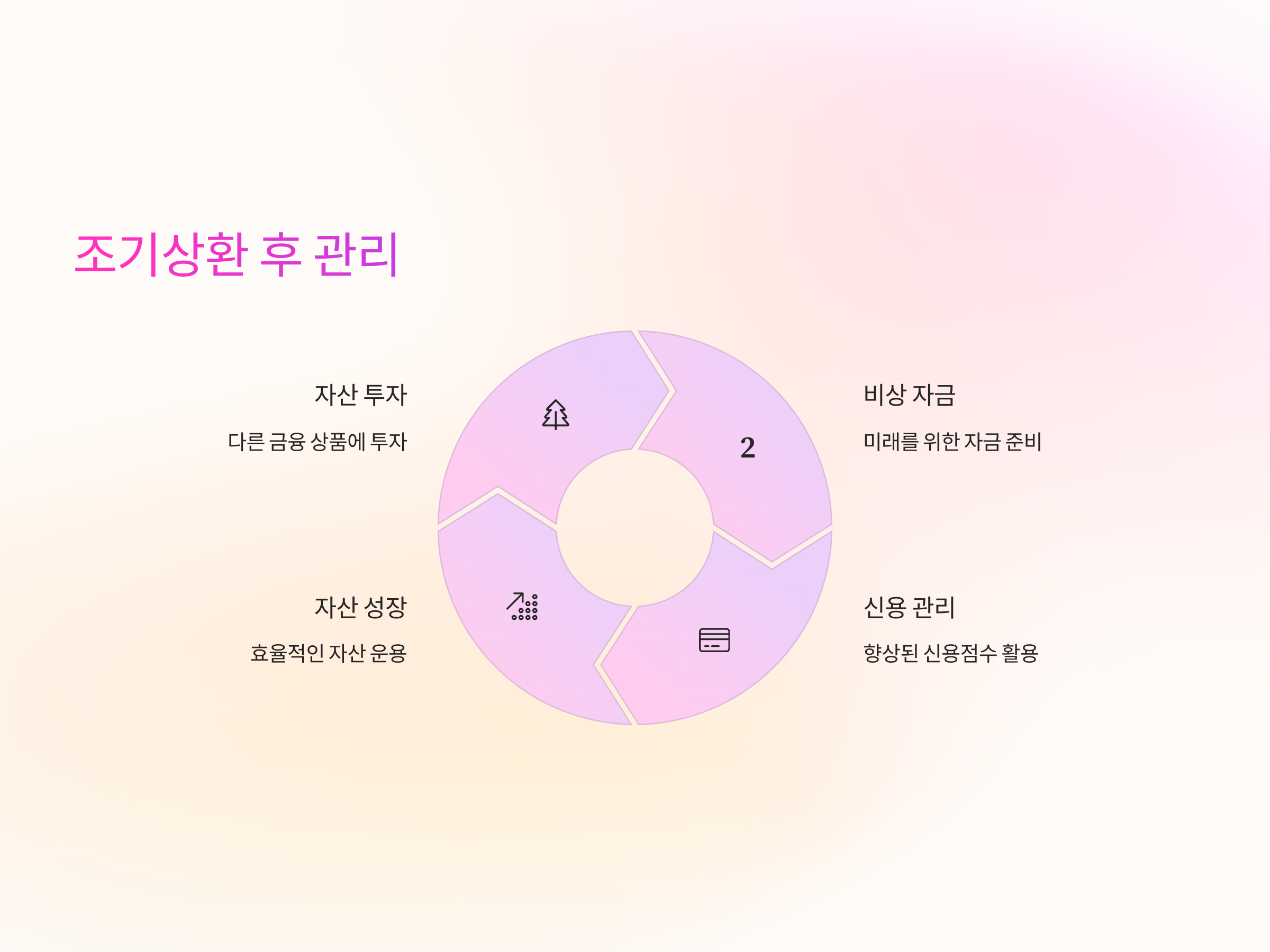 조기 상환을 마친 후, 중요한 점은 그 다음 관리입니다. 대출을 다 갚은 후에는 더 이상 월 상환금을 지불할 필요가 없지만, 재정 관리를 잘 하는 것이 중요합니다. 조기 상환으로 얻은 금액을 다른 금융 상품에 투자하거나, 비상 자금을 준비하는 등의 방법으로 자산을 보다 효율적으로 관리할 수 있습니다. 또한, 조기 상환 후에는 신용 점수가 높아질 수 있으므로, 차후 대출을 받을 때 더 유리한 조건을 얻을 수 있는 기회가 될 수 있습니다.