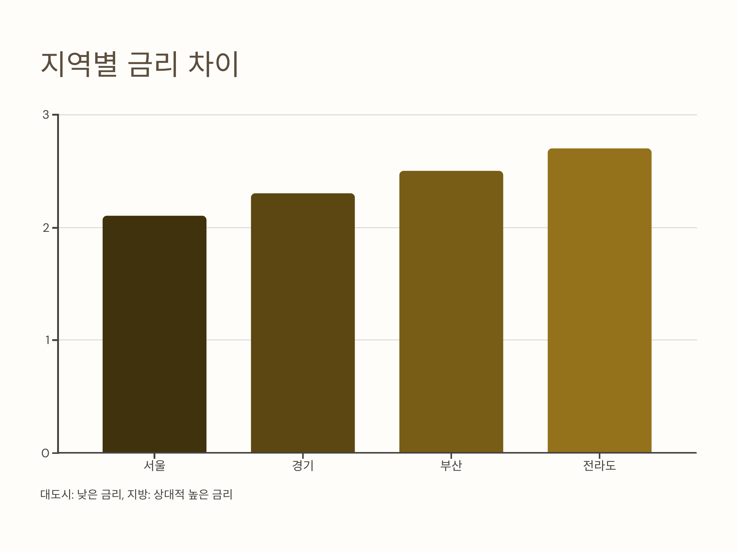 이 차이점은 대출 금리와 대출 한도에 영향을 미치는데, 특히 대도시에서는 주택 가격이 높아 대출 금리가 낮고 대출 한도가 늘어나는 경향이 있습니다. 반면 지방에서는 집값이 낮기 때문에 상대적으로 대출 조건이 조금 더 제한적일 수 있습니다.