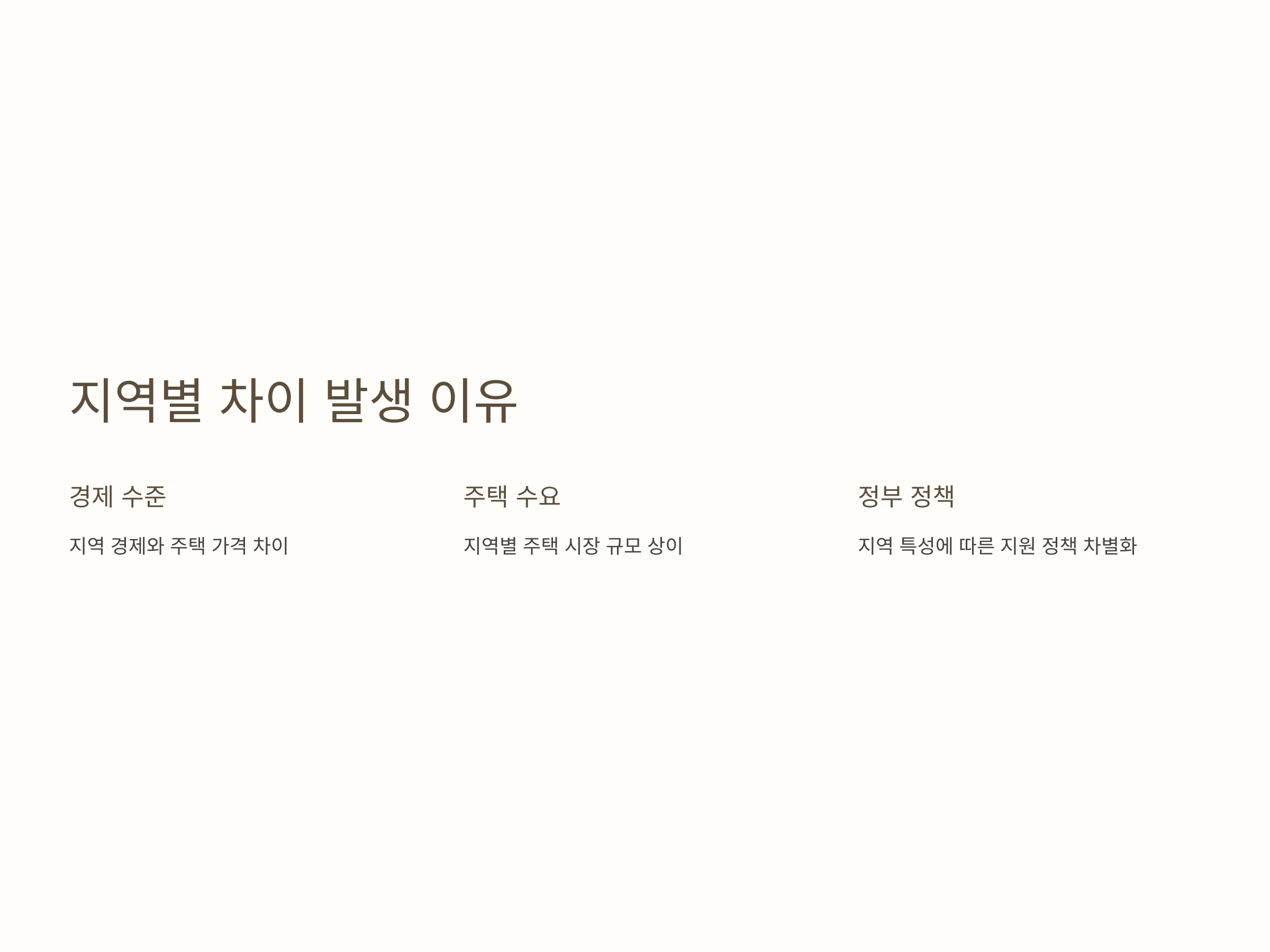 디딤돌 대출의 지역별 차이는 크게 두 가지 이유로 발생합니다. 첫째, 지역 경제 수준과 주택 가격 차이가 있기 때문입니다. 대도시와 지방 도시의 경제 수준이나 주택 가격에 따라 대출 한도나 금리가 달라질 수 있습니다. 둘째, 각 지역의 주택 수요에 따라 정부의 지원 정책이 다를 수 있습니다. 예를 들어, 수도권에서는 상대적으로 집값이 높기 때문에 대출 한도가 늘어날 수 있는 반면, 지방은 주택 시장 규모가 작고 집값이 낮아 대출 한도나 조건이 달라질 수 있습니다.