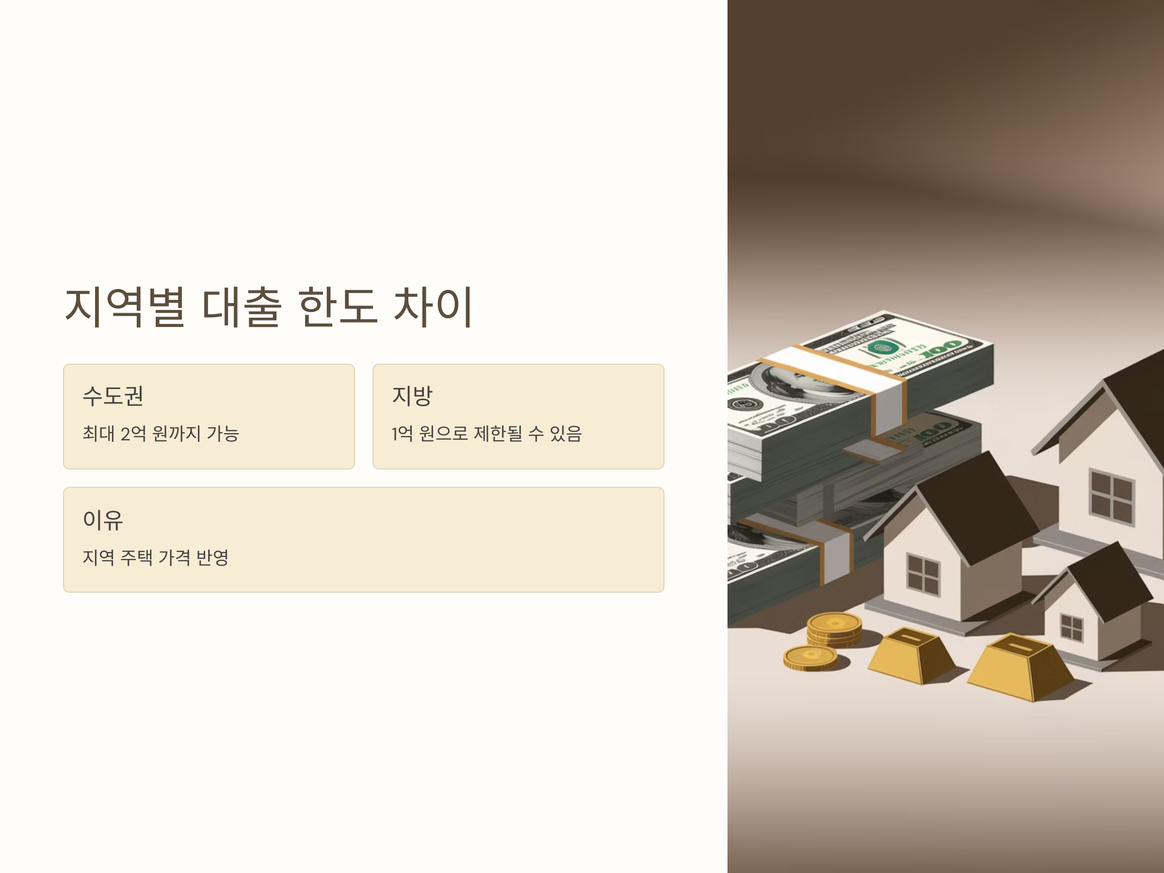 예를 들어, 서울과 경기 지역에서는 최대 2억 원까지 대출을 받을 수 있는 경우가 많습니다. 하지만 지방의 경우, 대출 한도가 1억 원으로 제한되는 경우도 종종 발생합니다. 이는 대출금액이 해당 지역의 주택 가격에 맞춰 조정되기 때문입니다.