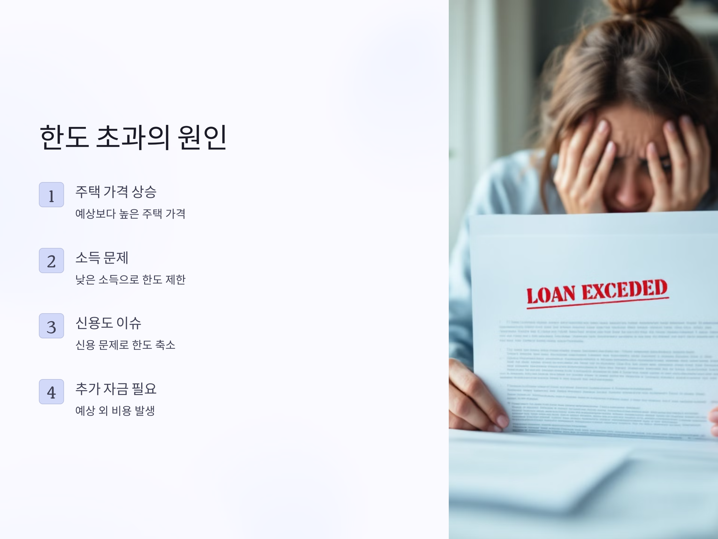 디딤돌 대출 한도가 초과되면, 필요한 자금을 모두 대출로 해결할 수 없게 됩니다. 주택 가격이 예상을 초과하거나, 추가적인 자금이 필요한 경우가 대표적인 원인입니다. 또한, 신청자의 소득이나 신용도 문제로 인해 대출 한도가 낮게 설정되기도 합니다. 이러한 상황이 발생하면 대출을 받지 못하거나, 대출 한도를 초과해 더 높은 이자율을 적용받을 수 있습니다.