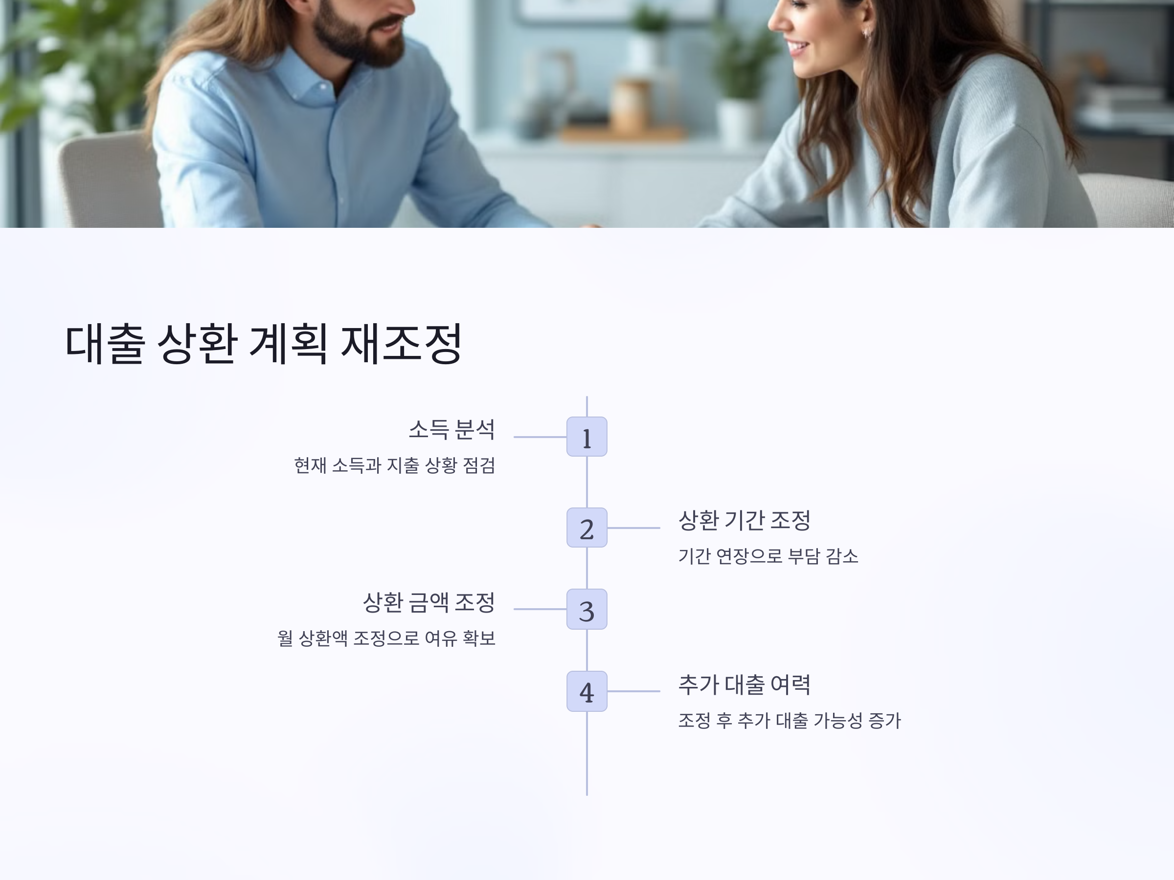 상환 계획을 재조정할 때는 현재의 소득 수준과 지출 상황을 면밀히 분석하고, 상환 기간을 늘리는 방법이나 상환 금액을 줄이는 방법을 고려할 수 있습니다. 상환 계획을 조정함으로써, 추가 대출을 받거나 다른 대출 상품을 활용할 수 있는 여유를 만들 수 있습니다.
