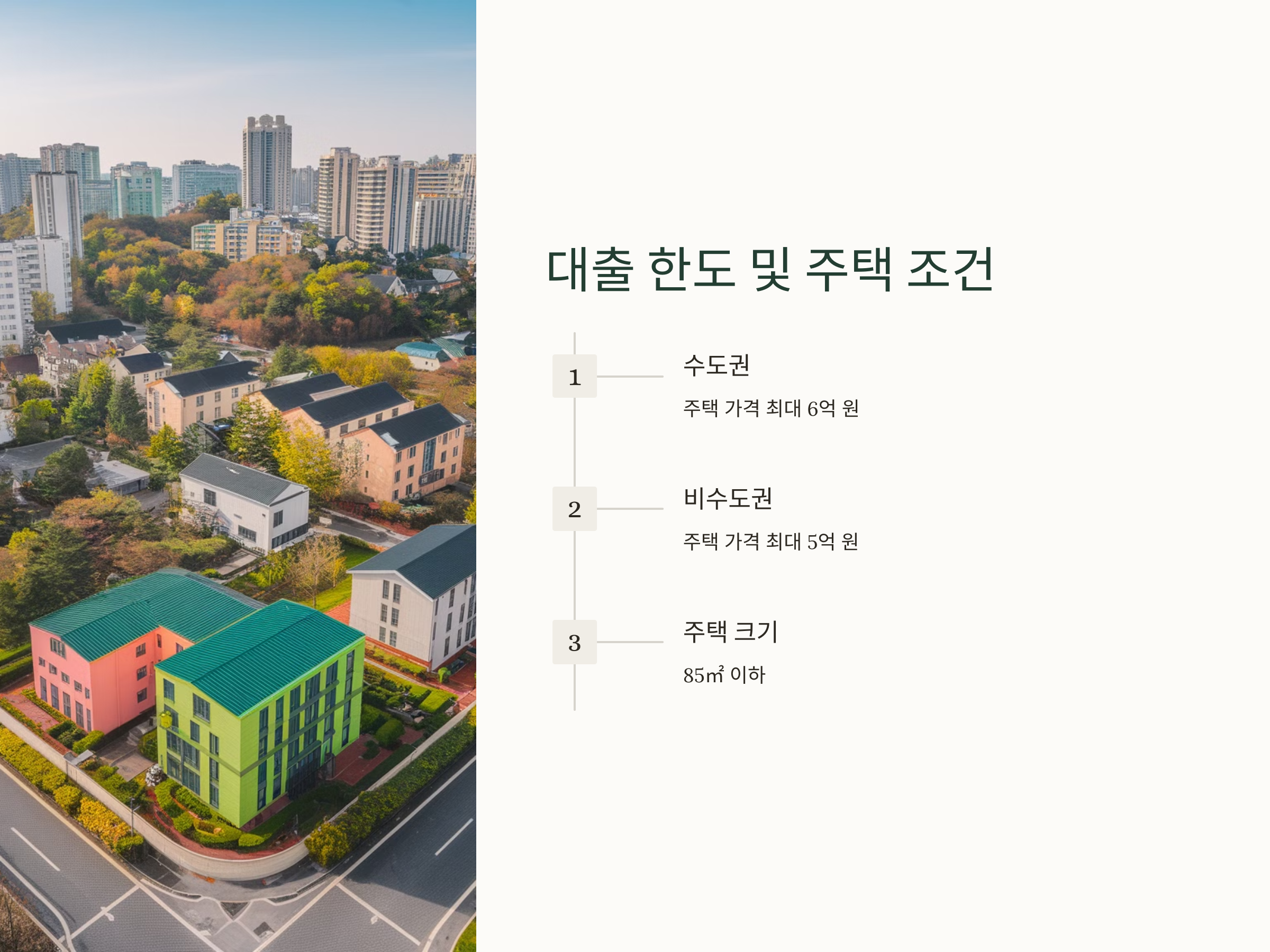 또한, 대출 실행 전 필수 조건으로 주택 가격이 수도권은 최대 6억 원, 비수도권은 5억 원을 초과할 수 없으며, 주택 크기도 85㎡ 이하로 제한됩니다. 이러한 기준은 대출 신청자들의 부담을 줄이고, 정부가 지원하는 대출의 정확한 타겟을 설정하려는 의도로 보입니다【12†source】.