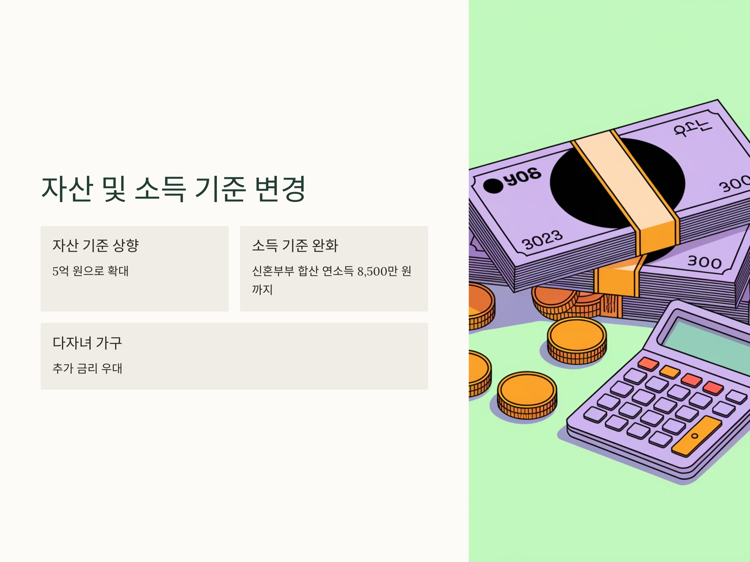 또한, 2025년부터는 자산 기준이 상향 조정되어 일부 고소득 및 자산을 보유한 사람들도 디딤돌 대출을 받을 수 있게 되었습니다. 기존에는 4억 8,800만 원의 자산 기준이 적용되었으나, 이제는 5억 원으로 확대되어 더 많은 신청자가 혜택을 받을 수 있게 되었습니다【12†source】. 이런 변화는 대출 심사의 강화뿐만 아니라, 실수요자의 자격 요건을 세밀하게 조정하는 방향으로 이어졌습니다.